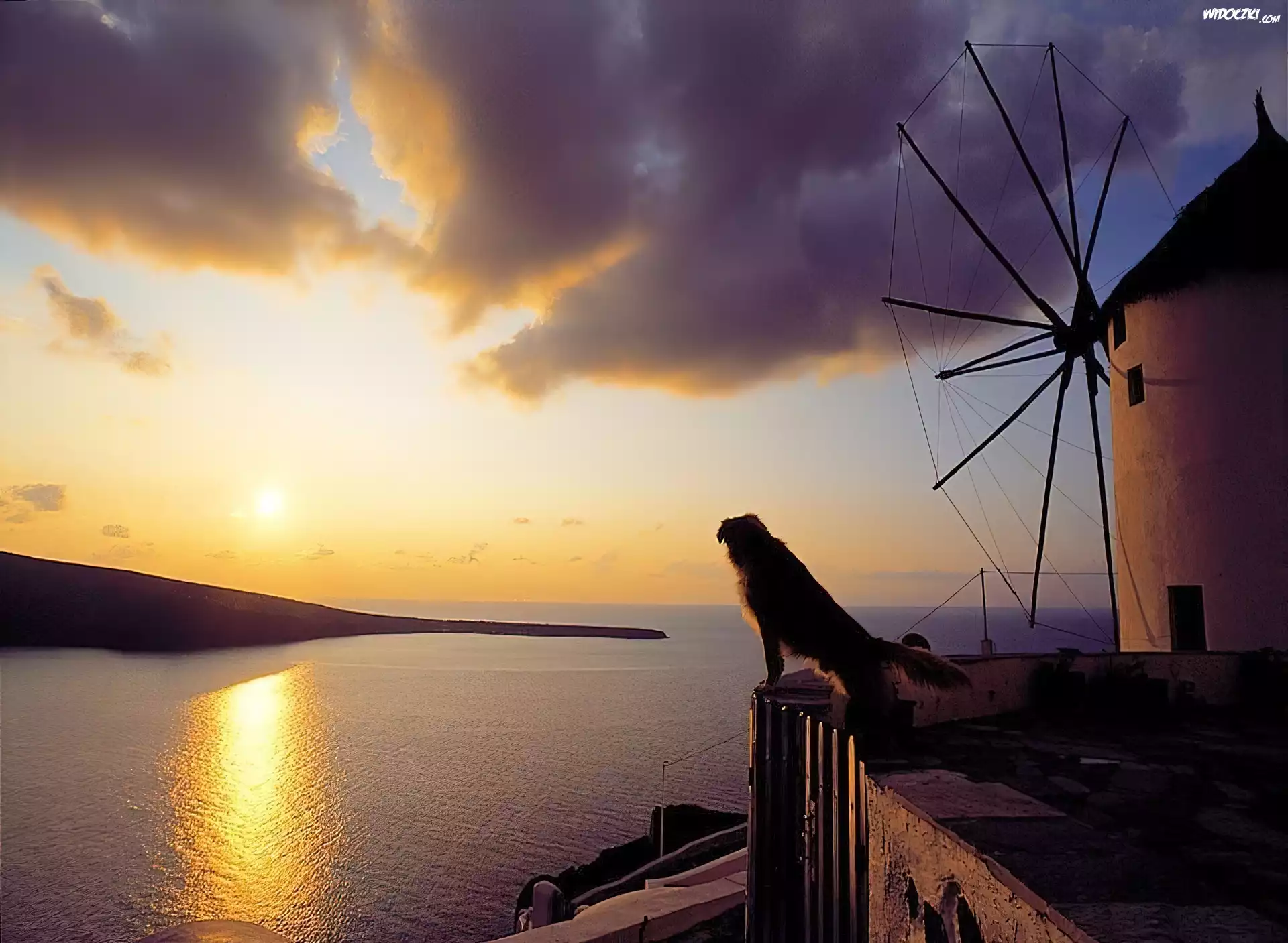 Zdjęcia, Pies, Wiatrak, Zachód, Słońca