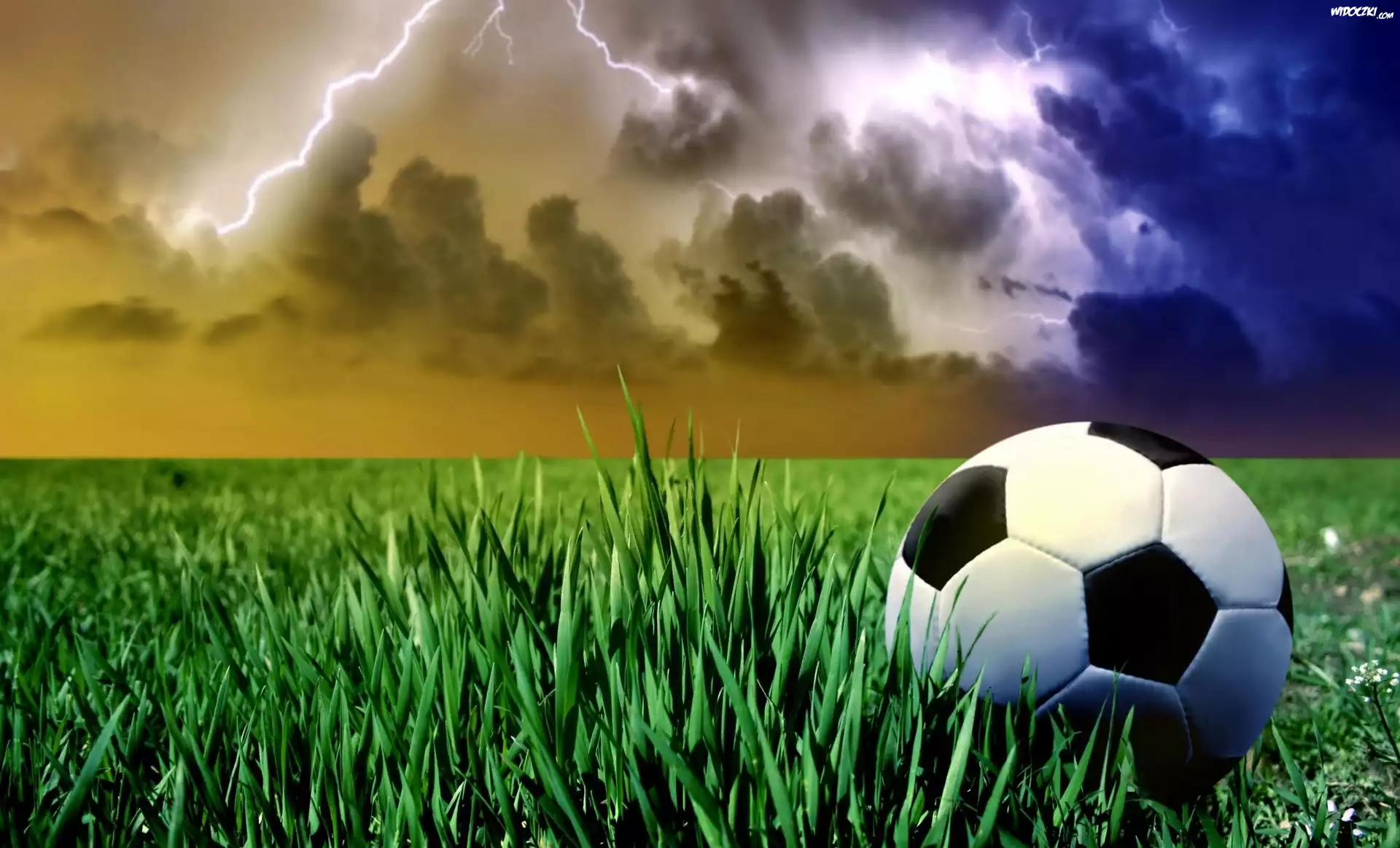 Zdjęcia, Piłka, Zielona, Trawa, Zachmurzone, Niebo, Błyskawice