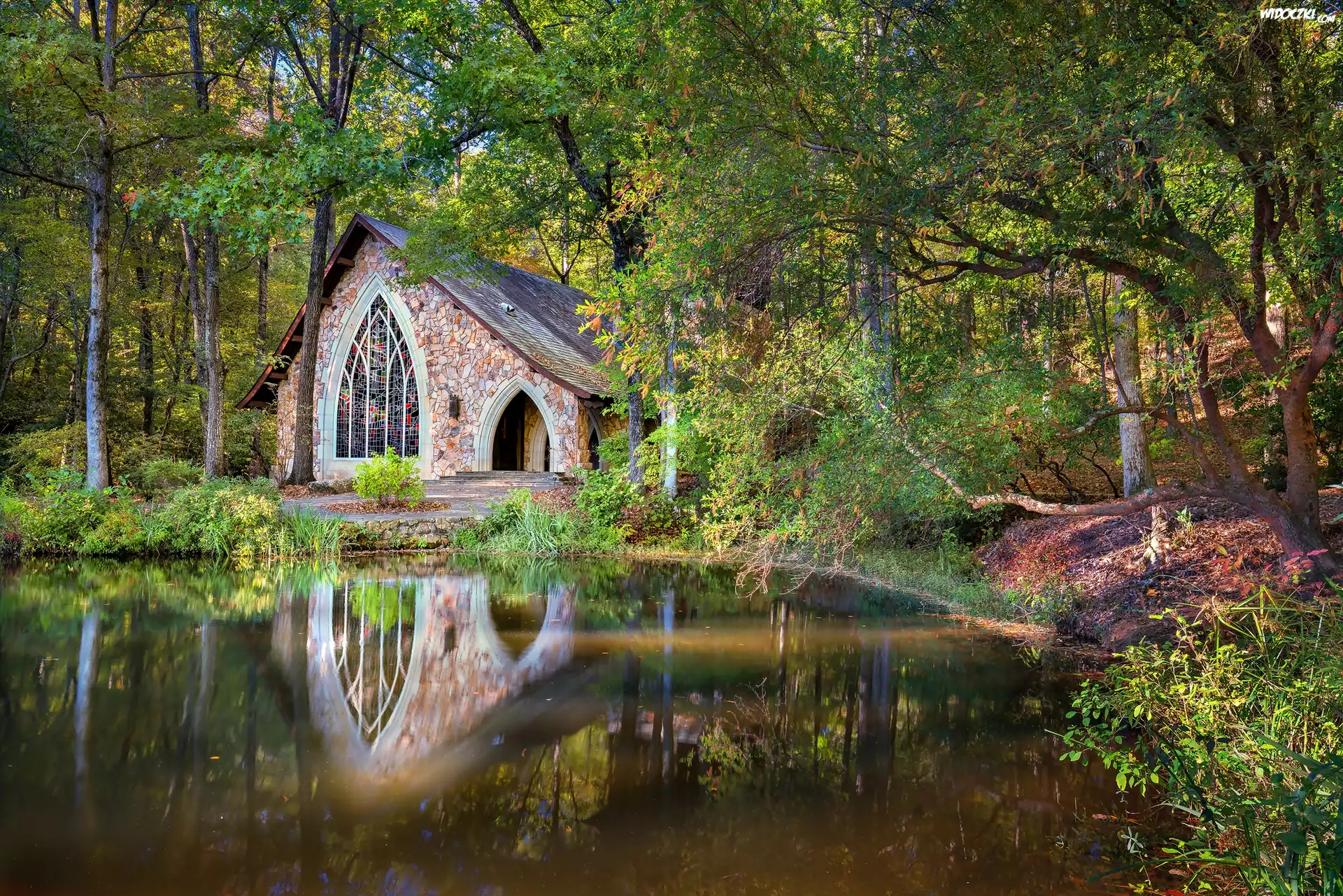 Stany Zjednoczone, Stan Georgia, Pine Mountain, Callaway Gardens, Kapliczka, Las, Jezioro Falls Creek Lake |