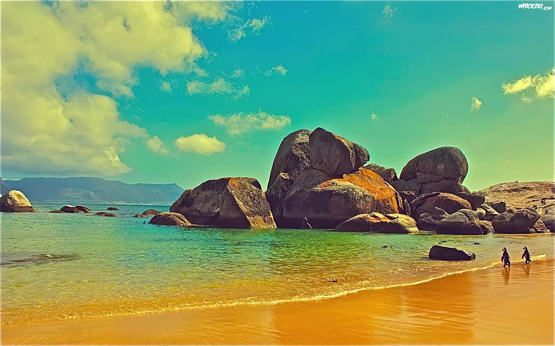 Pingwiny, Skały, Plaża, Chmury, Woda