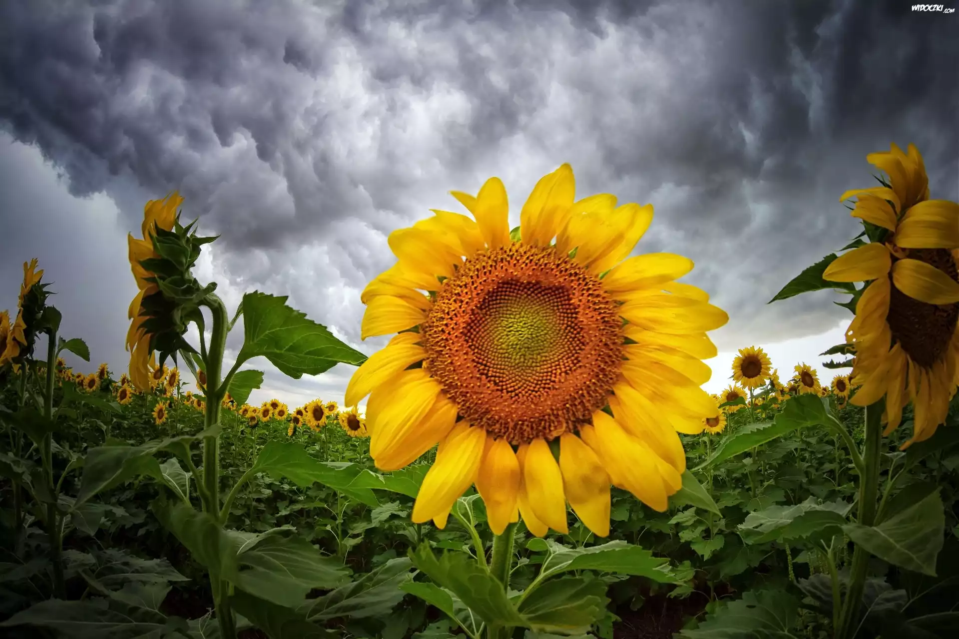 Zdjęcia, Plantacja, Słoneczników, Ciemne, Chmury