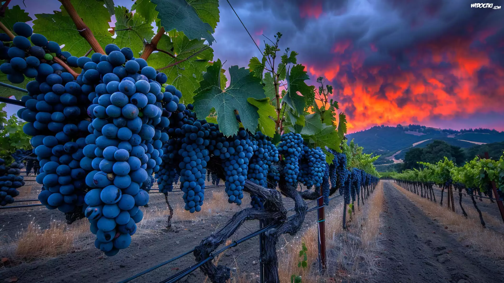 Zdjęcia, Winogrona, Kiście, Liście, Plantacja, Chmury, Zachód słońca