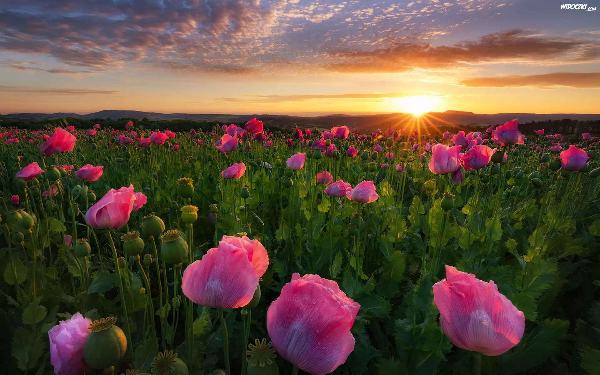 Zdjęcia, Plantacja, Różowe, Maki, Promienie Słońca