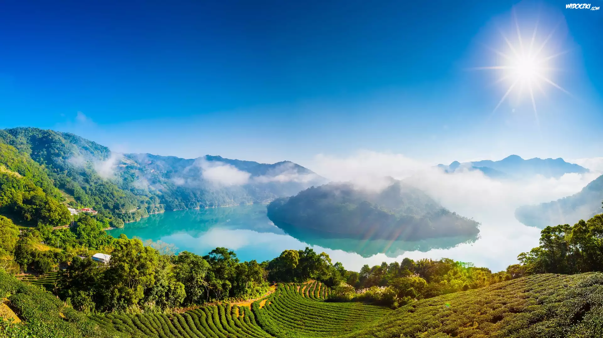 Zdjęcia, Plantacja, Jezioro, Góry, Słońce, Krajobraz