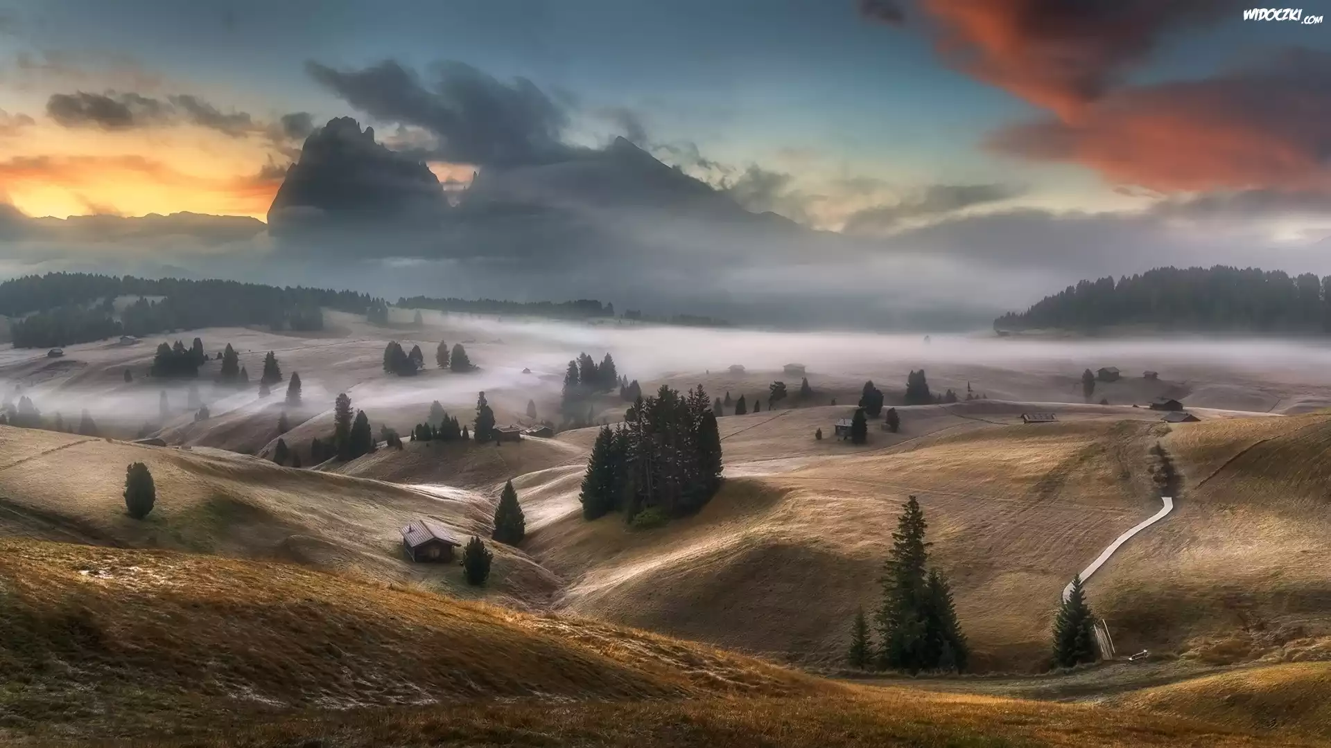 Zdjęcia, Płaskowyż, Seiser Alm, Dolina Val Gardena, Góry Sassolungo, Włochy, Dolomity, Mgła, Domy, Jesień