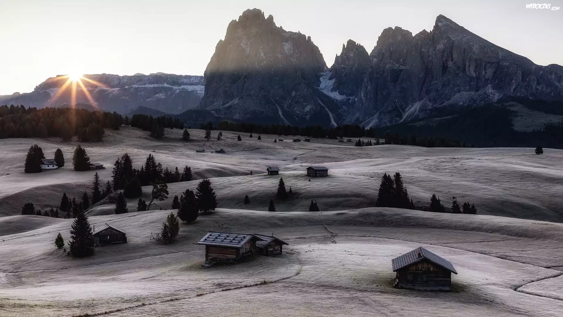 Płaskowyż, Seiser Alm, Dolina Val Gardena, Góry Sassolungo, Włochy, Dolomity, Promienie słońca, Domy |