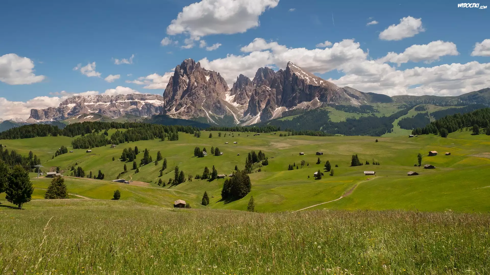 Zdjęcia, Płaskowyż Seiser Alm, Dolina Val Gardena, Góry Sassolungo, Dolomity, Domy, Drzewa, Chmury, Włochy