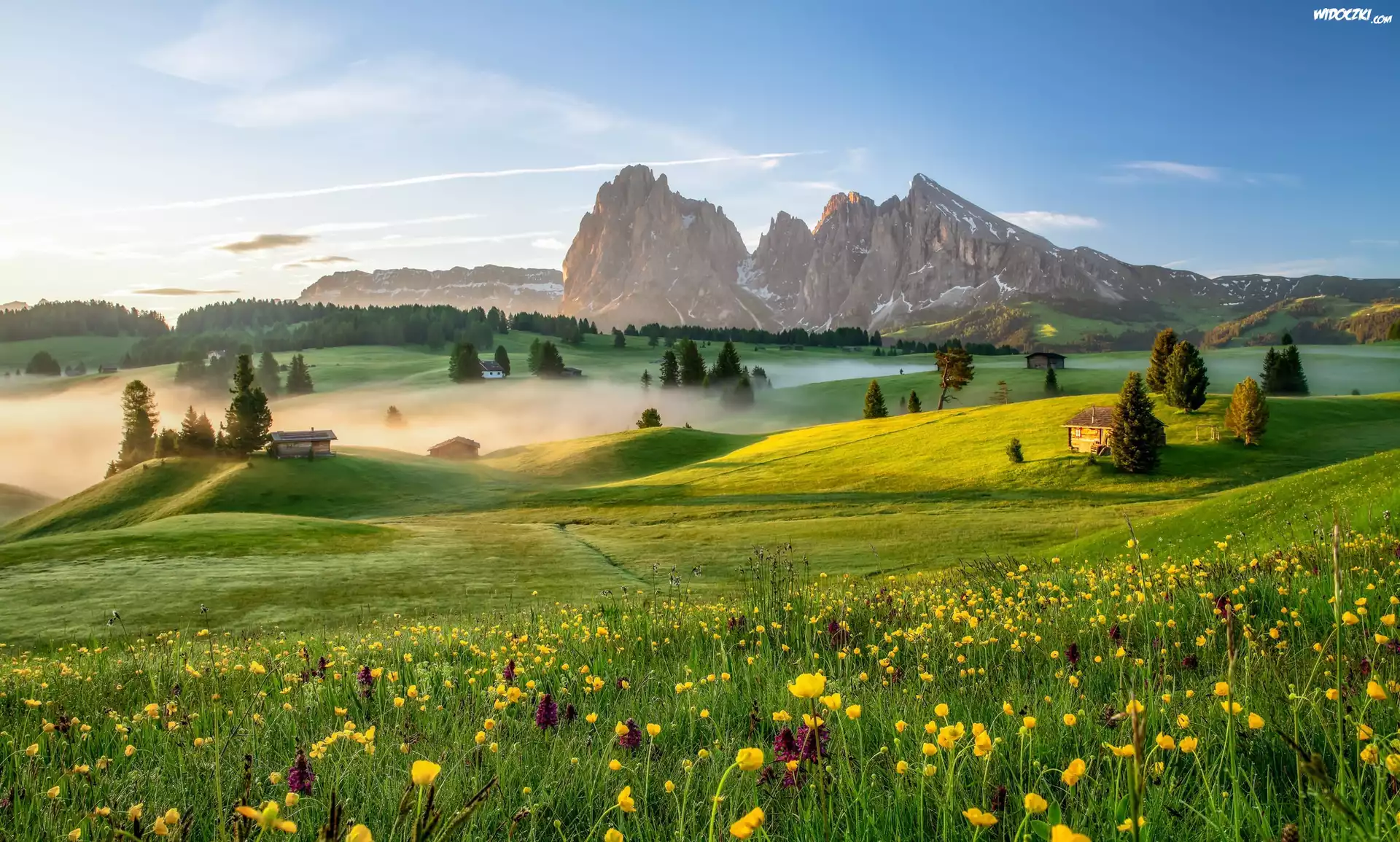 Płaskowyż Seiser Alm, Dolina Val Gardena, Góry Sassolungo, Włochy, Dolomity, Mgła, Domy, Łąka, Kwiaty, Drzewa |