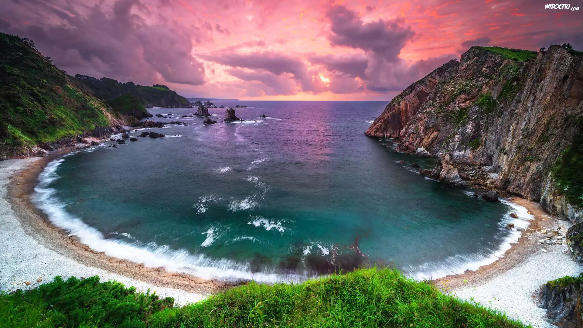Zdjęcia, Hiszpania, Asturia, Morze, Zachód słońca, Góry, Skały, Zatoka, Plaża, Playa del Silencio