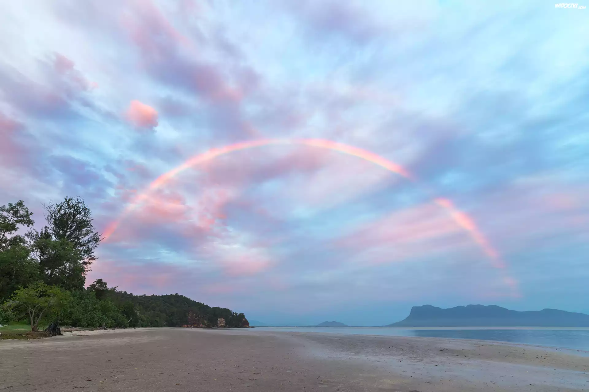 Zdjęcia, Drzewa, Plaża, Morze, Góry, Chmury, Tęcza, Niebo