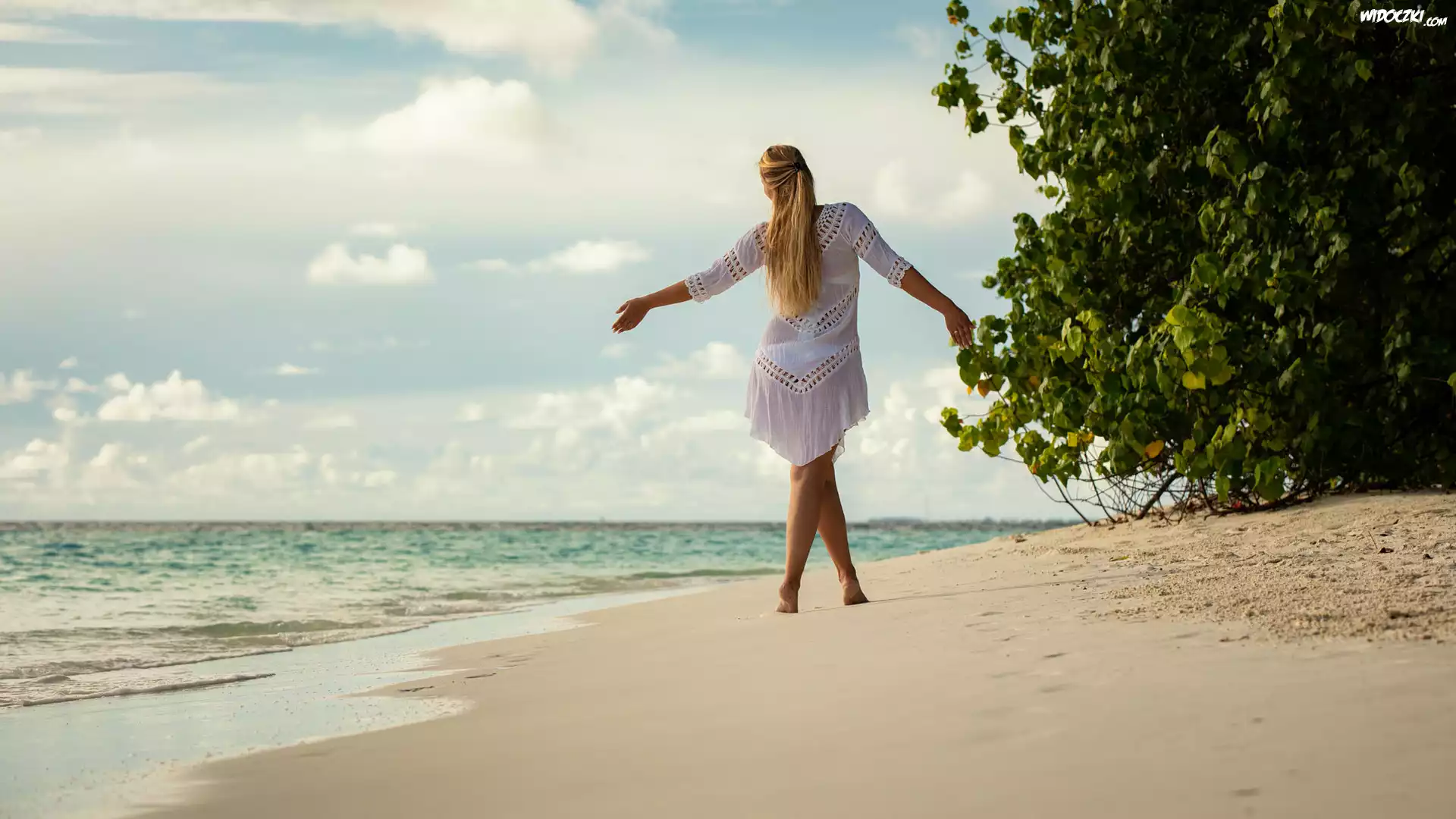 Zdjęcia, Dziewczyna, Letnia, Sukienka, Plaża, Piasek, Drzewa