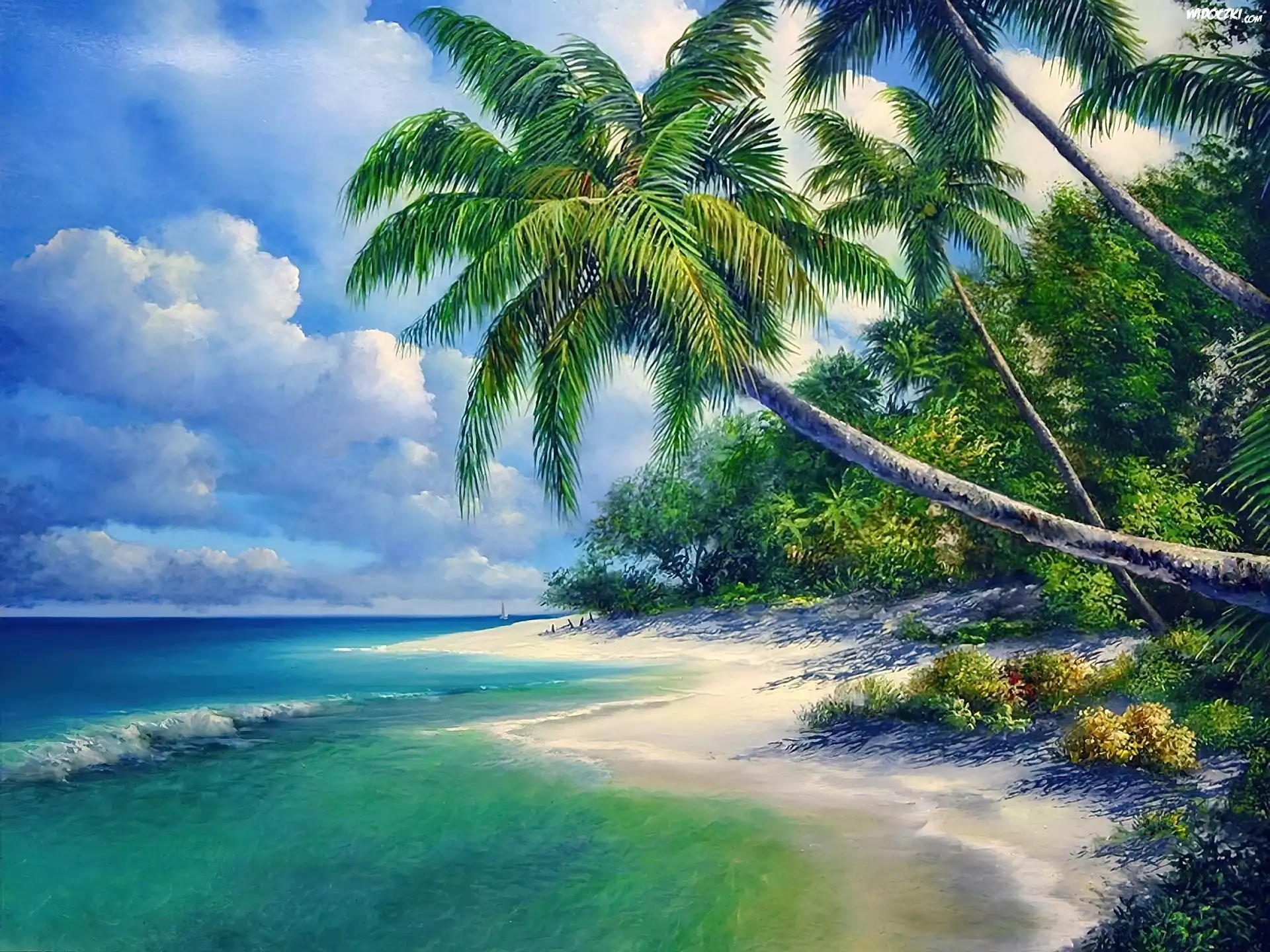 Zdjęcia, Plaża, Morze Fale, Palmy