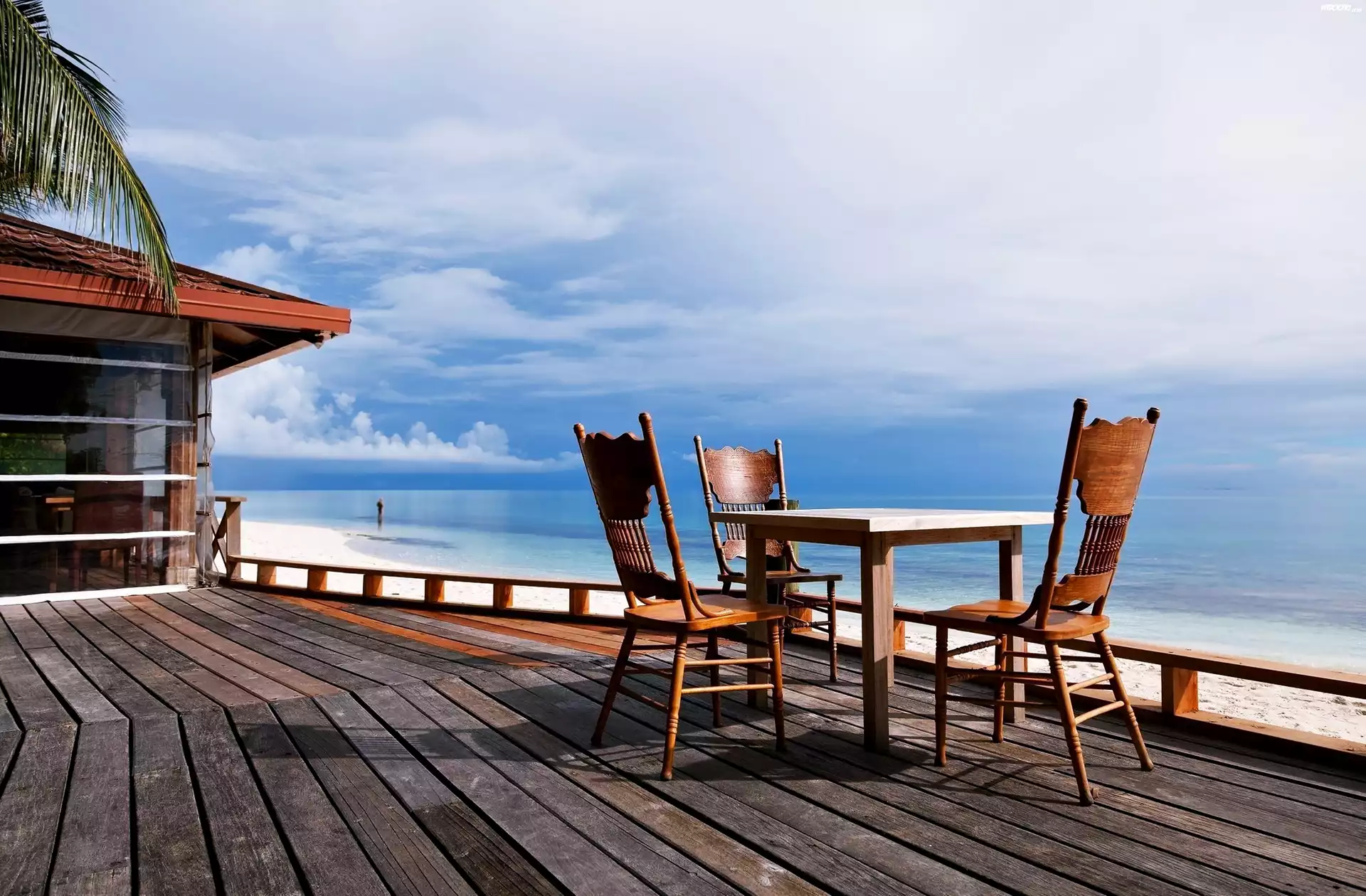 Plaża, Morze, Taras, Stolik, Krzesła, Palma