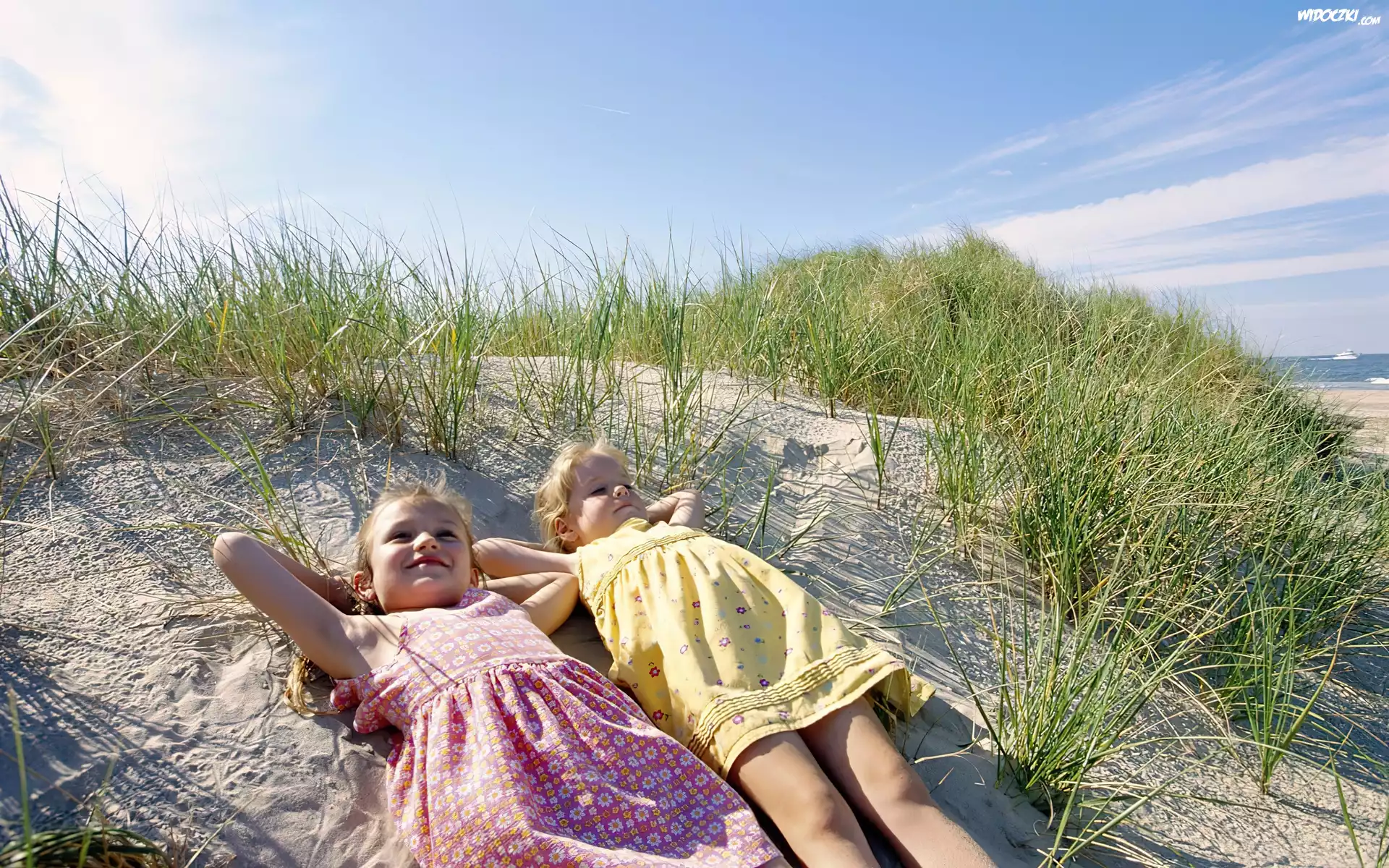 Zdjęcia, Plaża, Dzieci, Lato, Trawa
