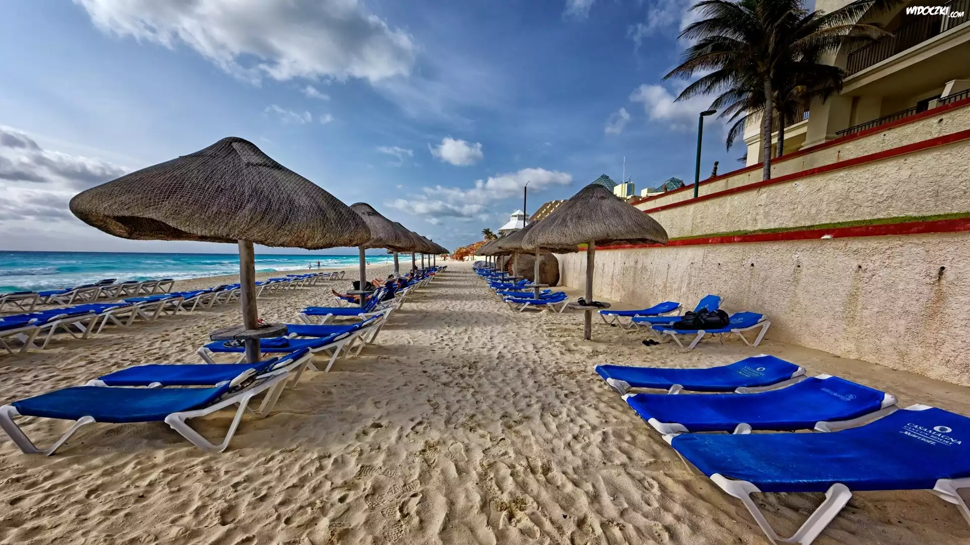 Zdjęcia, Plaża, Piasek, Leżaki, Parasole