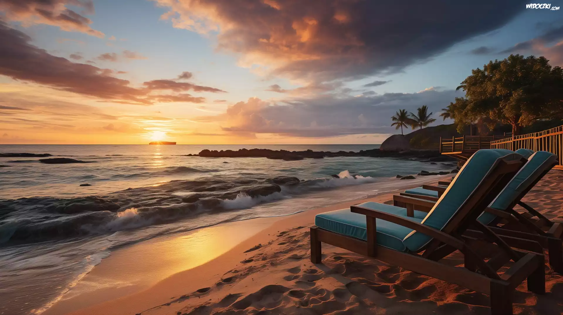 Zdjęcia, Morze, Plaża, Leżaki, Zachód słońca