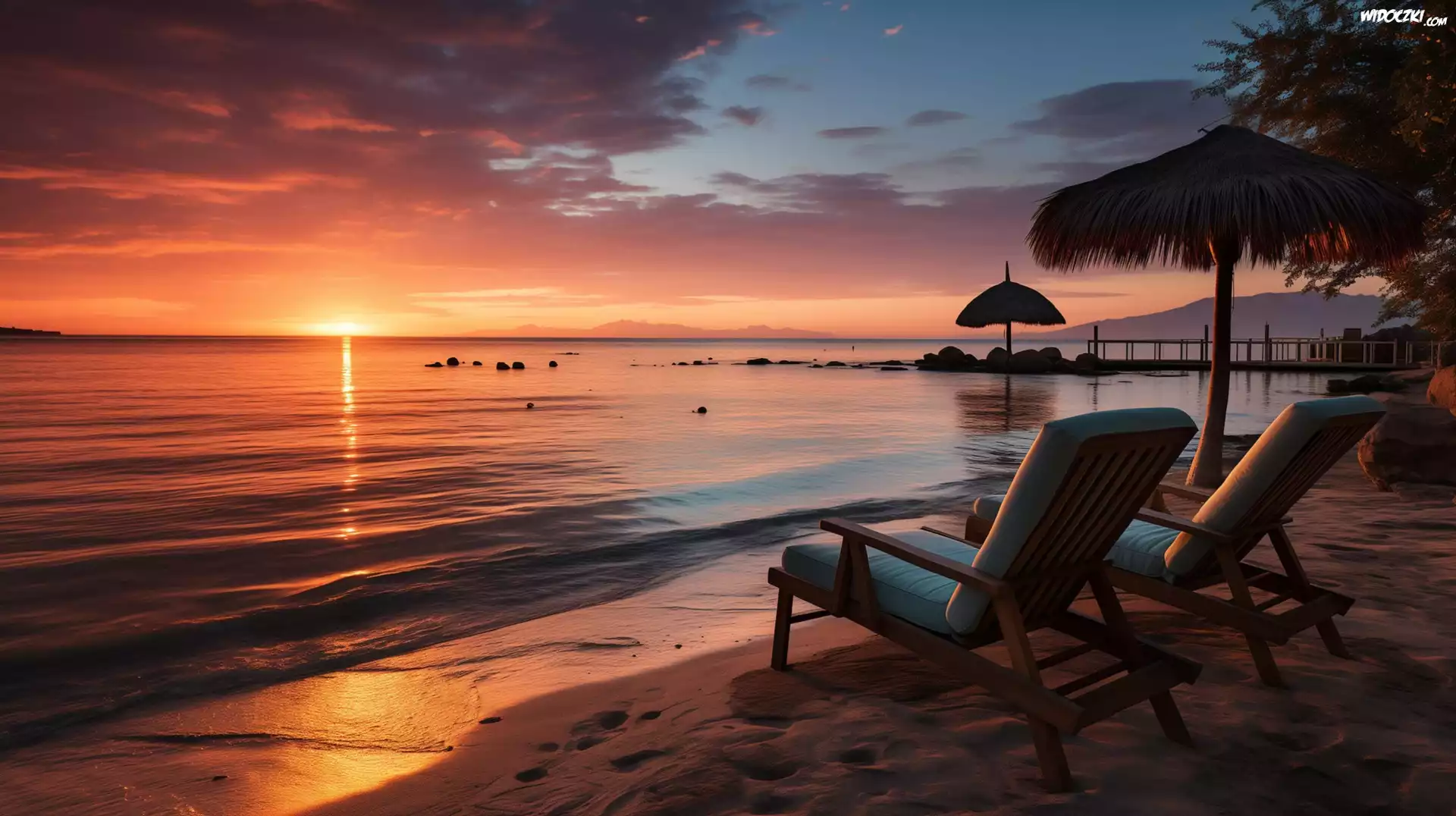 Morze, Plaża, Leżaki, Zachód słońca