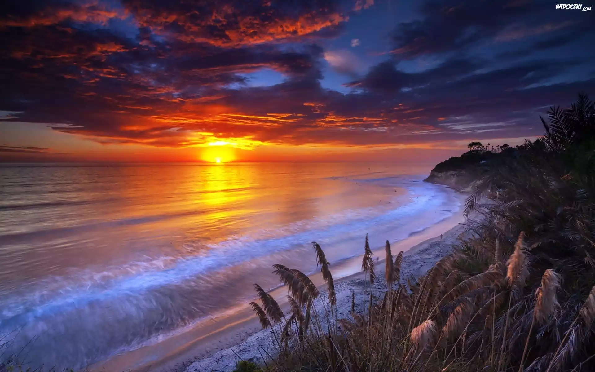 Zdjęcia, Morze, Plaża, Skały, Trawy, Zachód, Słońca, Chmury