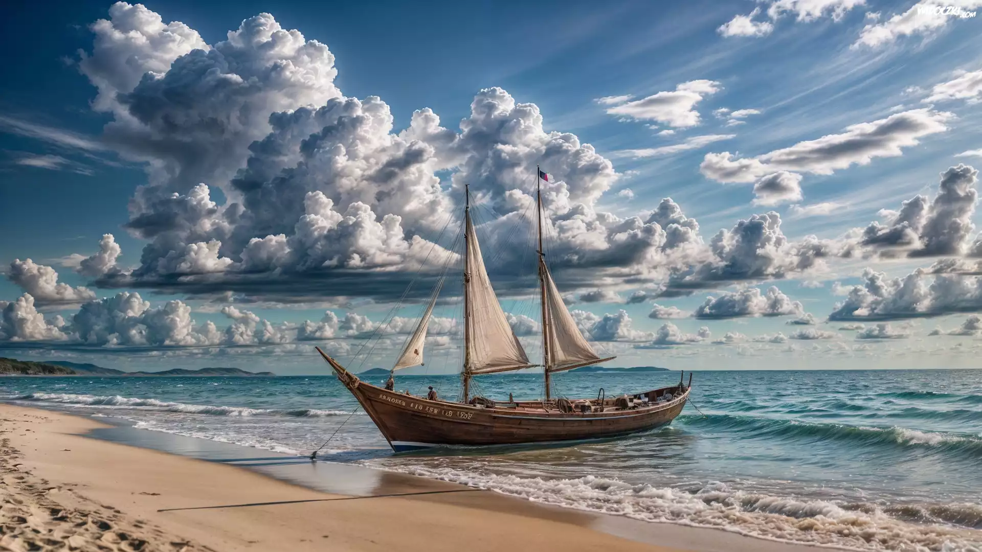 Żaglówka, Plaża, Morze, Chmury, Grafika