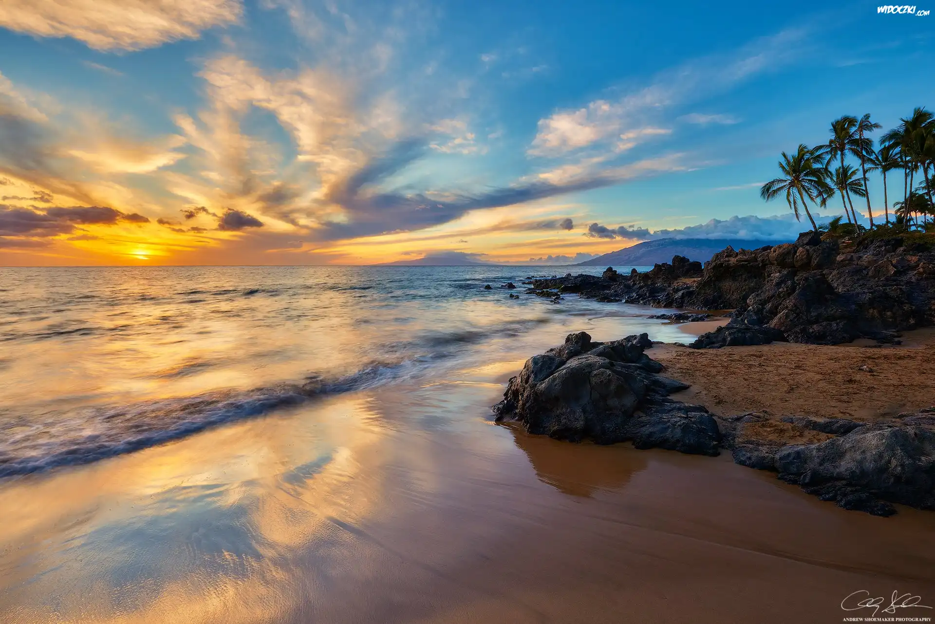 Zdjęcia, Hawaje, Plaża Kihei, Zachód słońca, Chmury, Palmy, Morze