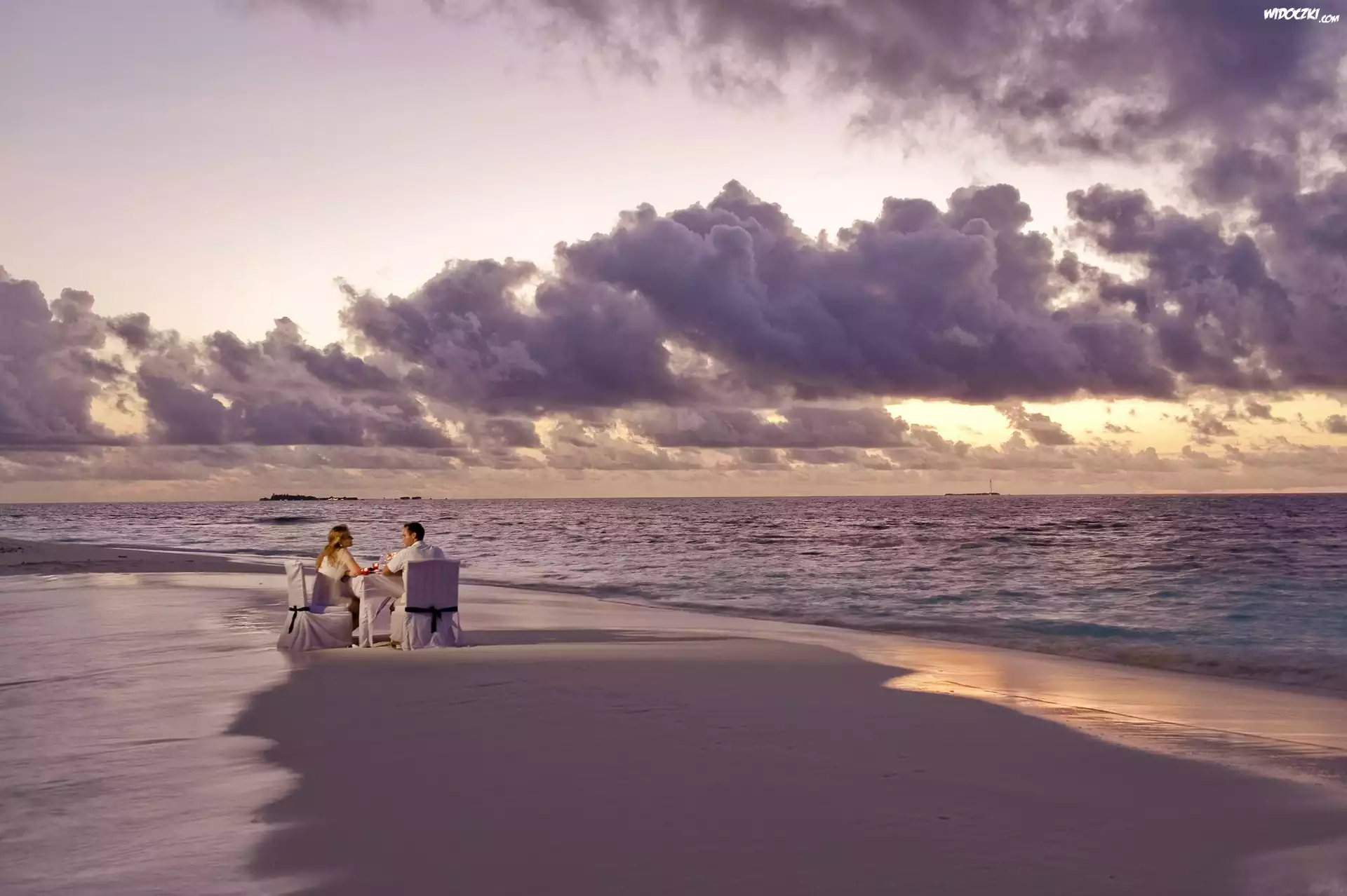 Zdjęcia, Morze, Plaża, Chmury, Mężczyzna, Kobieta, Stolik, Kolacja