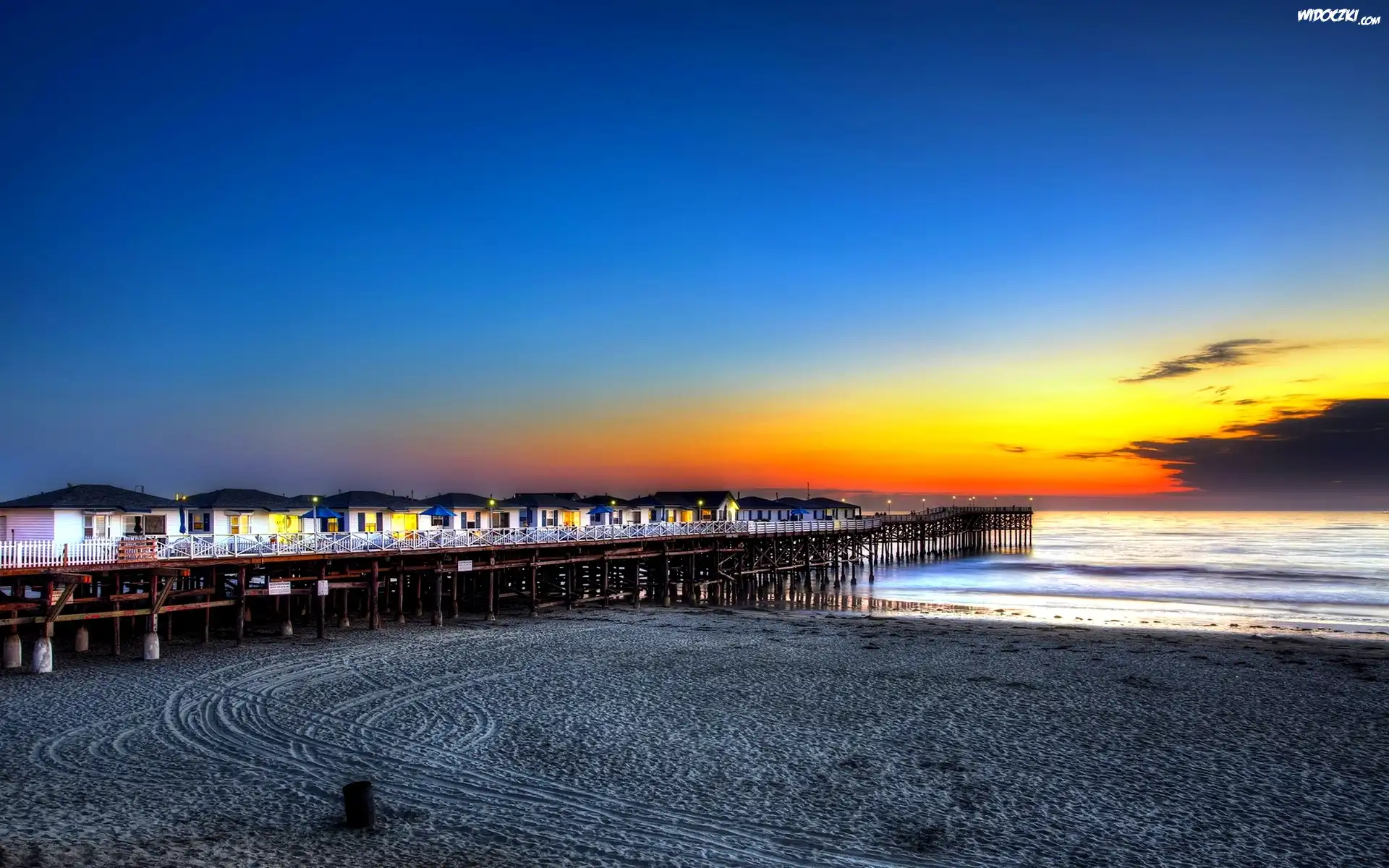 Zdjęcia, Morze, Plaża, Zachód Słońca, Domki, Lato, Molo