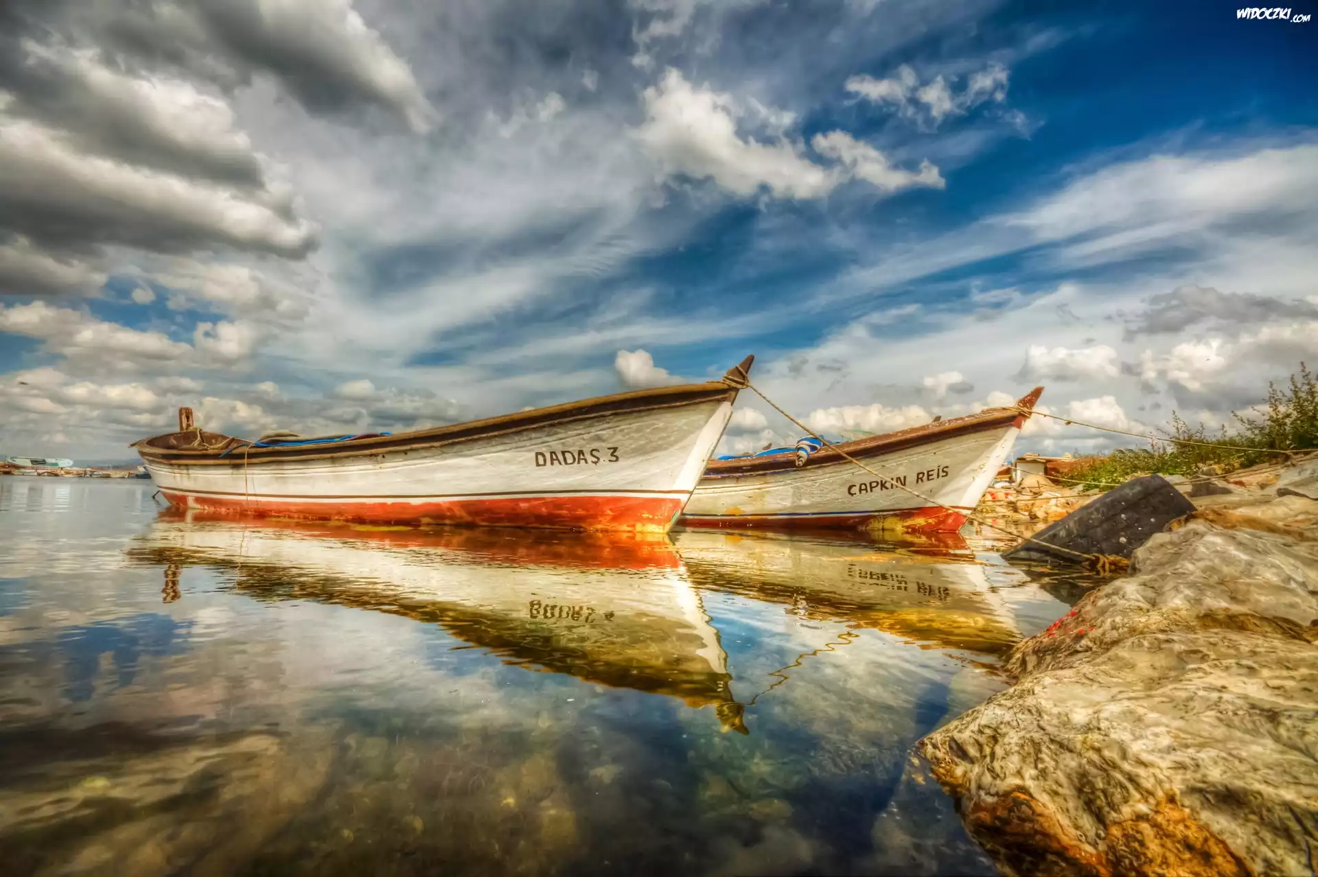 Zdjęcia, Morze, Plaża, Niebo, Chmury, Dwie, Łodzie, Odbicie
