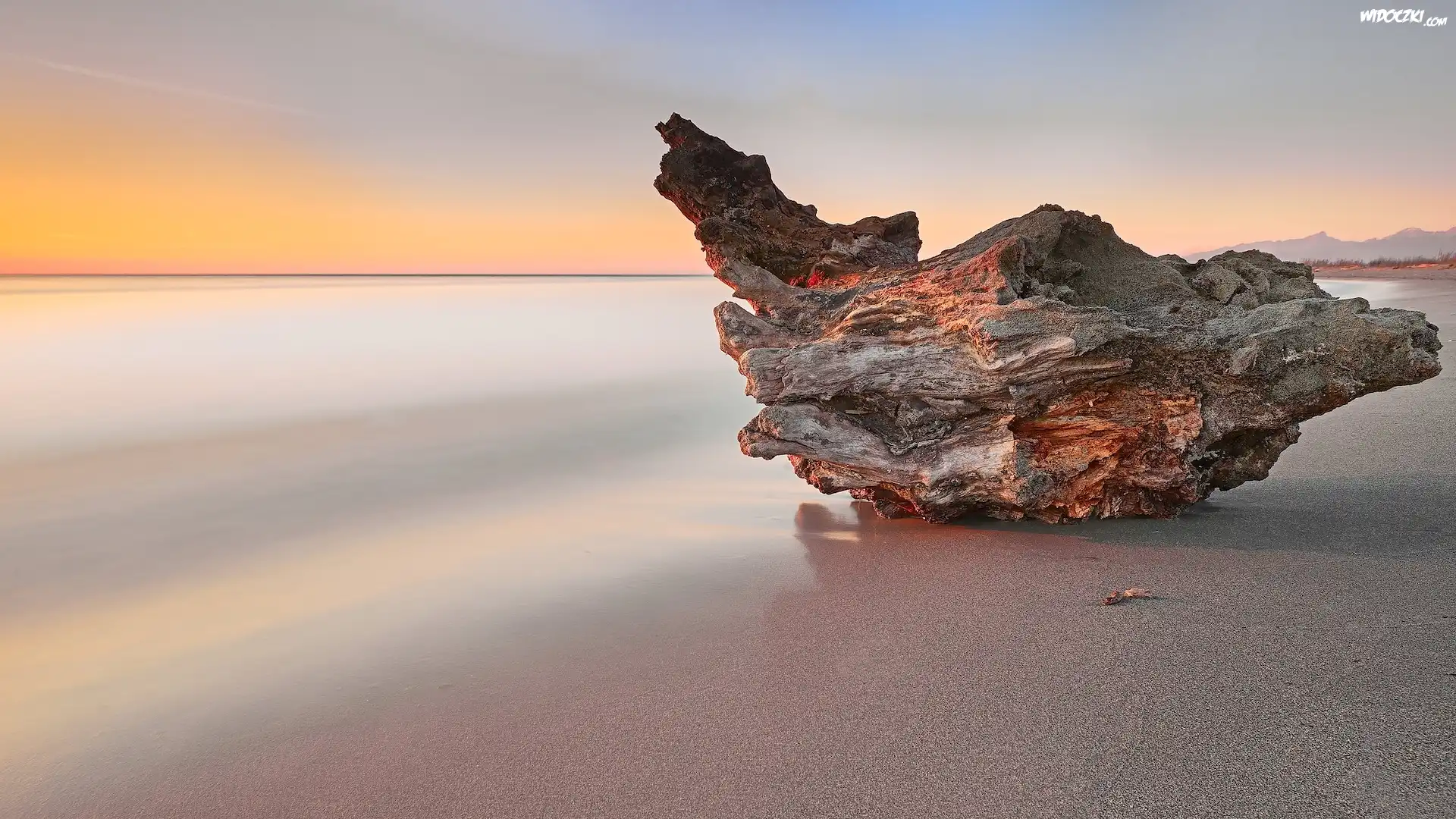 Zdjęcia, Morze, Plaża, Zachód słońca, Piasek, Konar, Pień