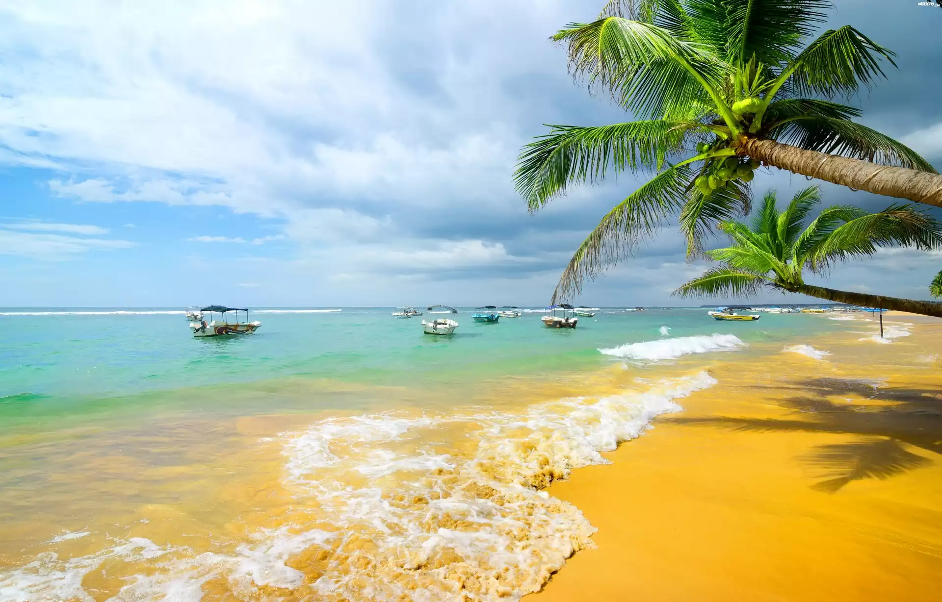Zdjęcia, Morze, Plaża, Fale, Palmy, Łódki, Tropikalny Raj