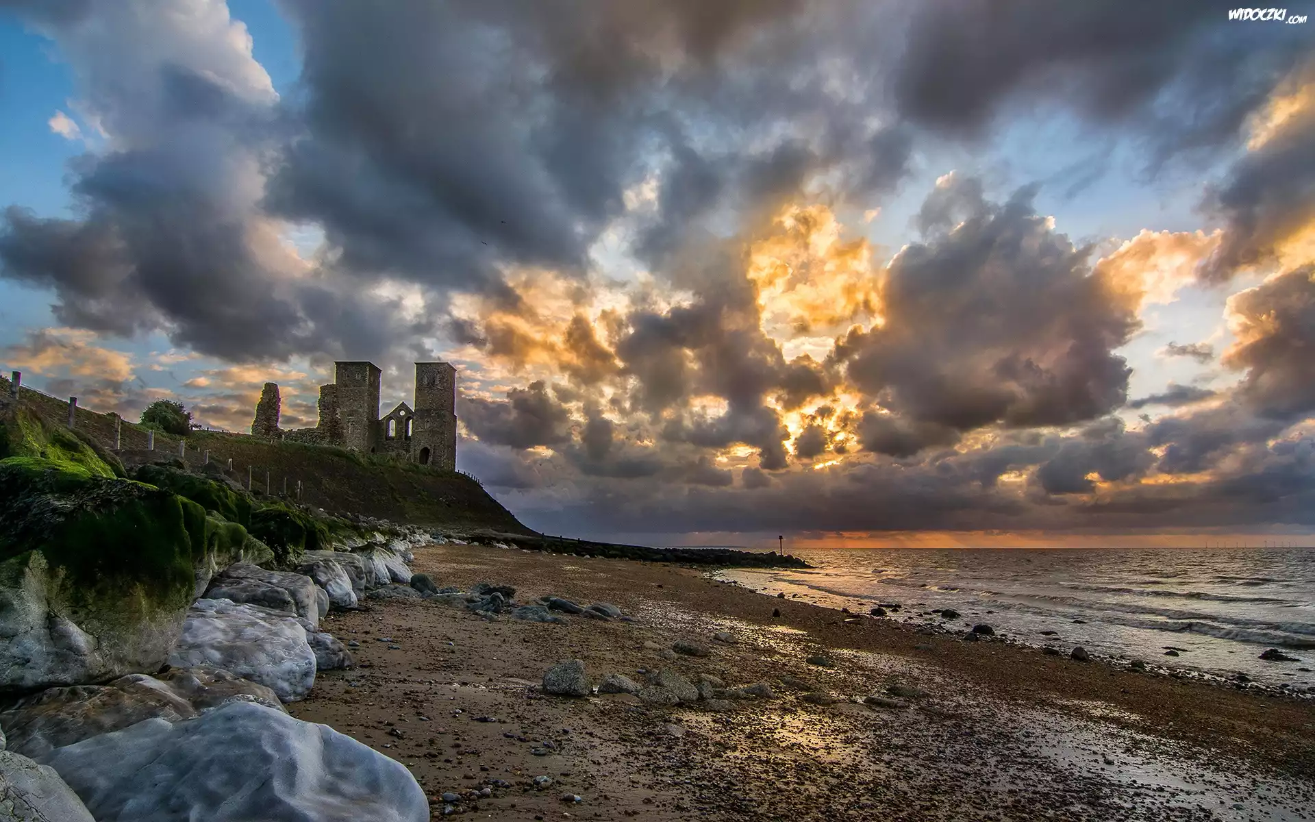 Morze, Plaża, Kamienie, Ruiny, Chmury, Zachód, Słońca