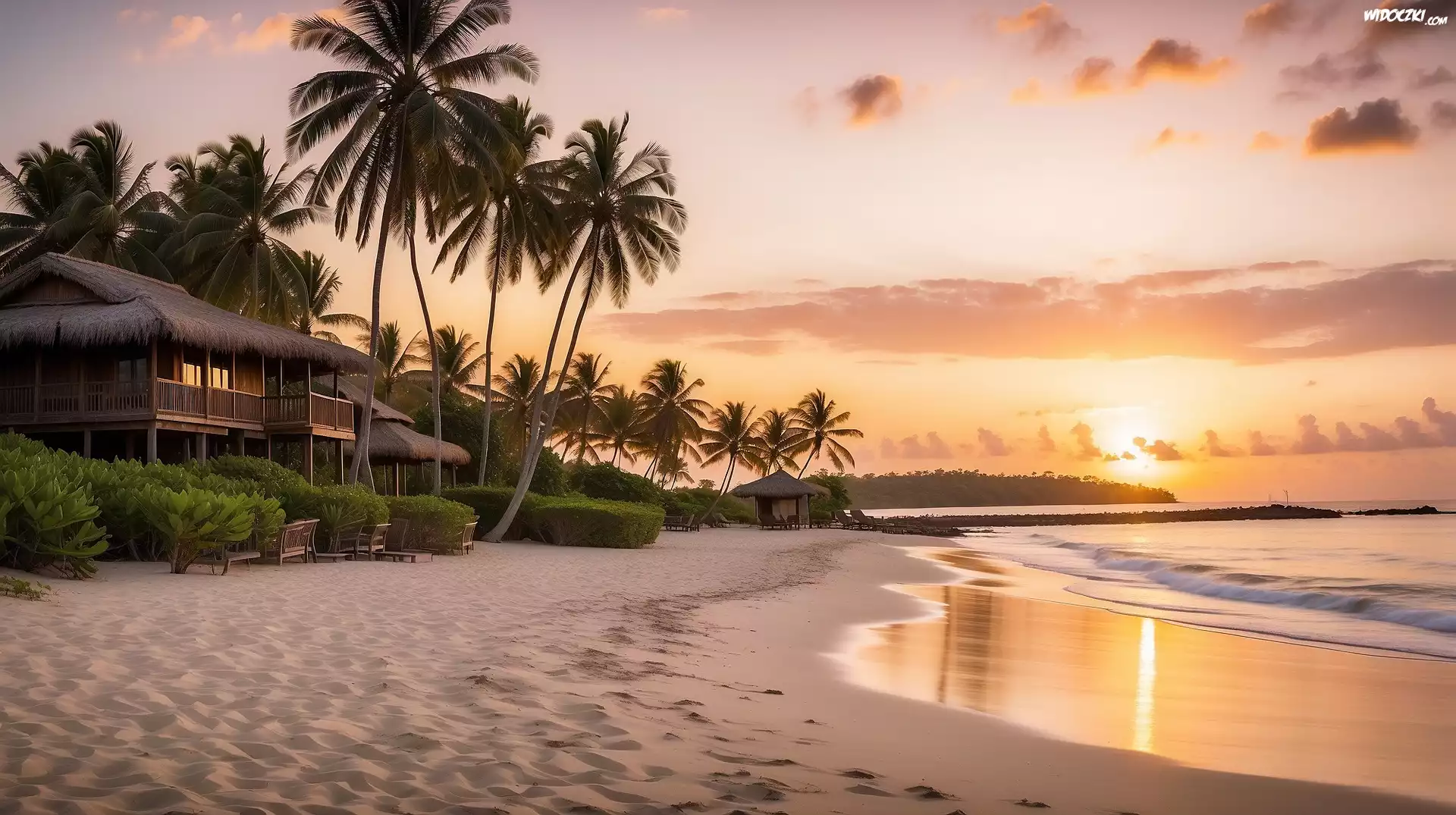 Zachód słońca, Morze, Plaża, Piasek, Palmy, Dom