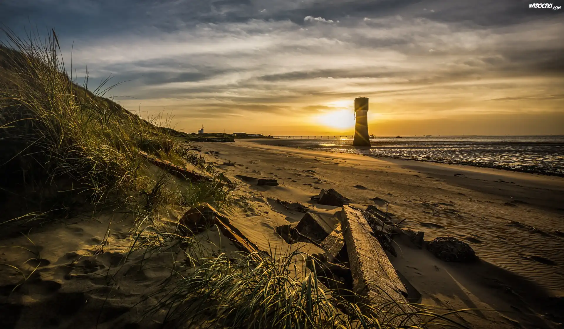 Zdjęcia, Plaża, Wschód słońca, Morze, Budowla