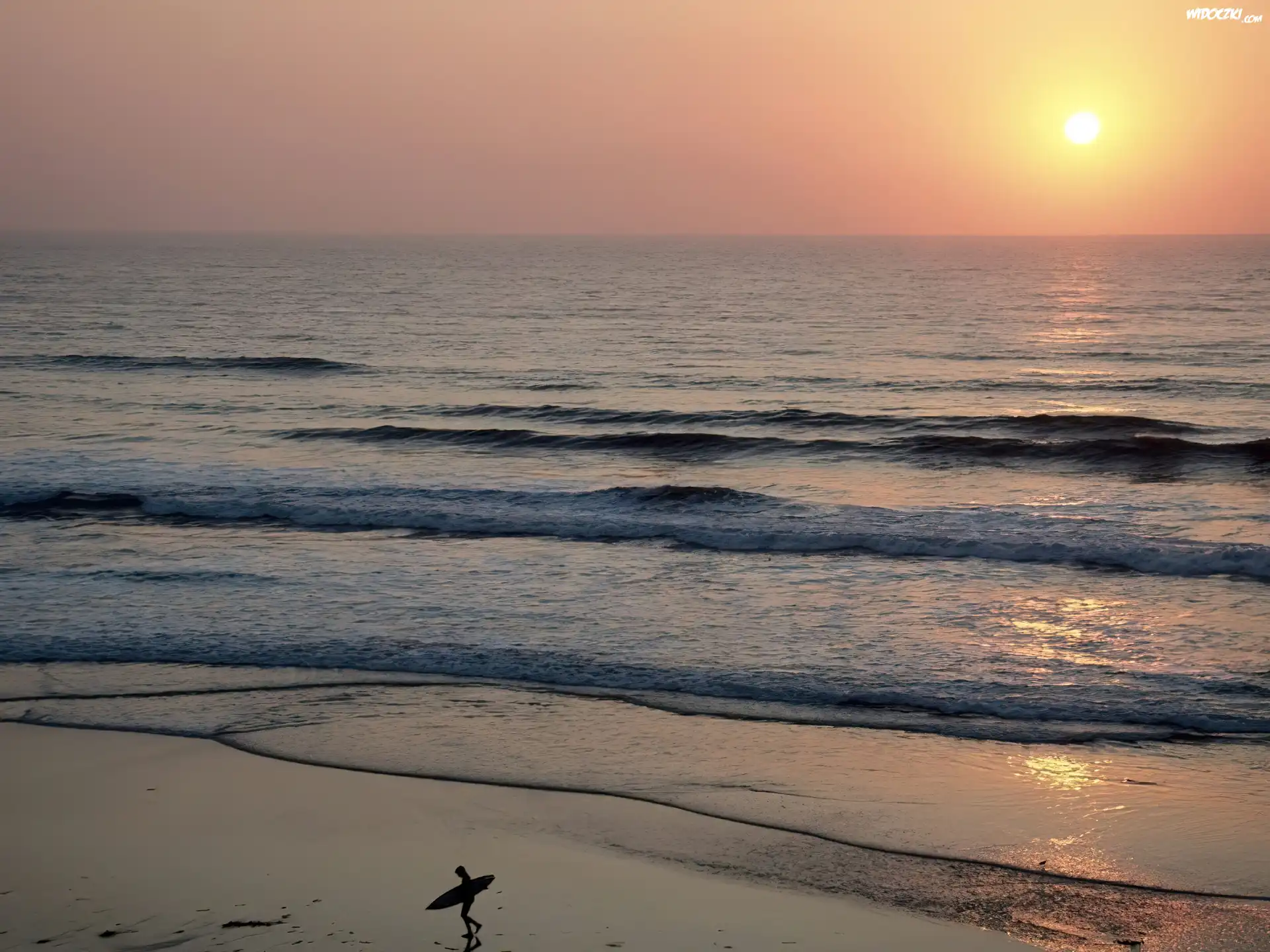 Zdjęcia, Plaża, Zachód Słońca, Morze, Fale