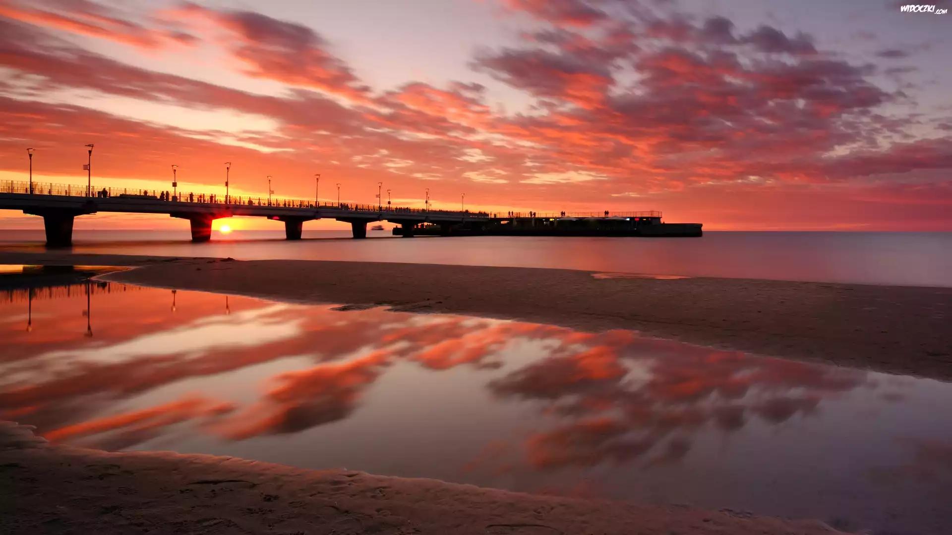 Zdjęcia, Molo, Plaża, Morze, Zachód słońca