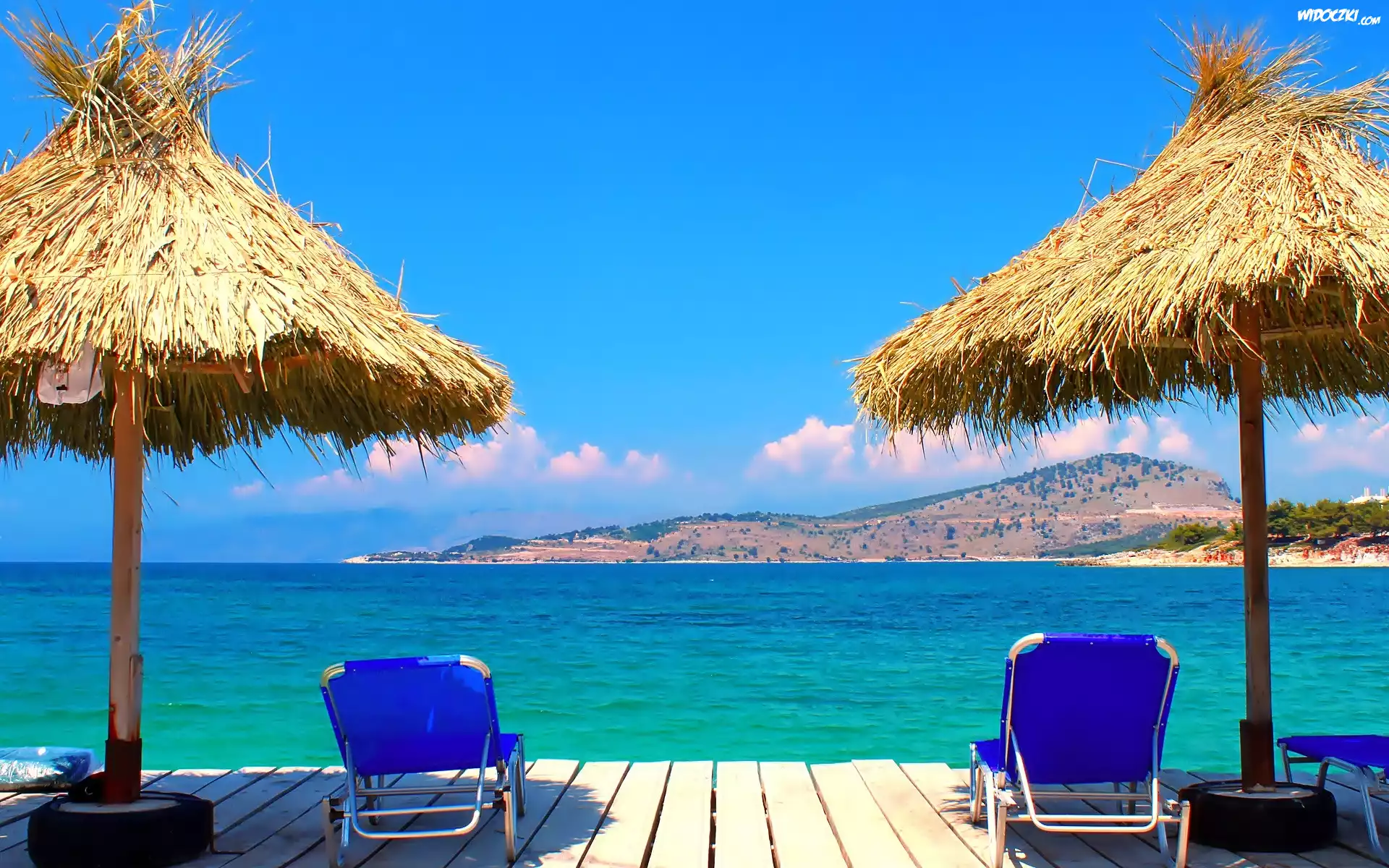 Zdjęcia, Morze, Plaża, Góry, Leżaki, Parasole, Tropiki, Wakacje