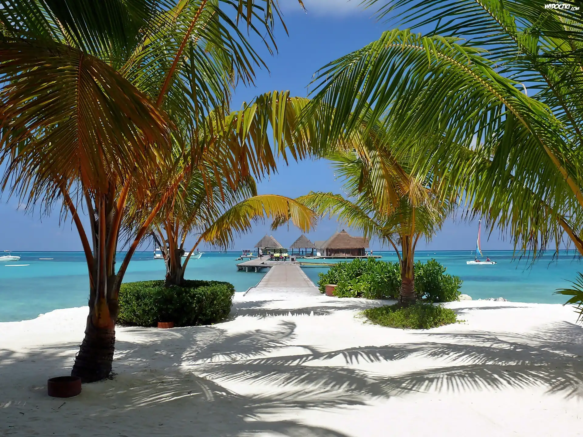 Zdjęcia, Morze, Plaża, Palmy, Pomost, Domki, Na Wodzie
