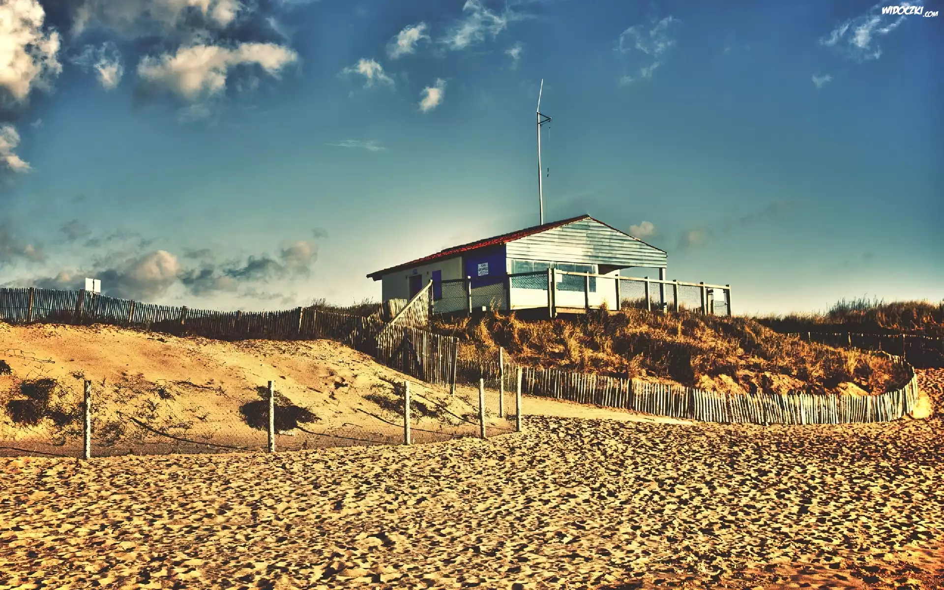 Zdjęcia, Plaża, Piasek, Ogrodzenia, Domek