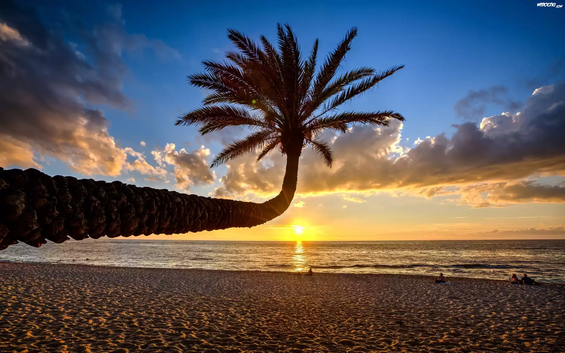 Zdjęcia, Plaża, Morze, Zachód Słońca, Palma, Chmury