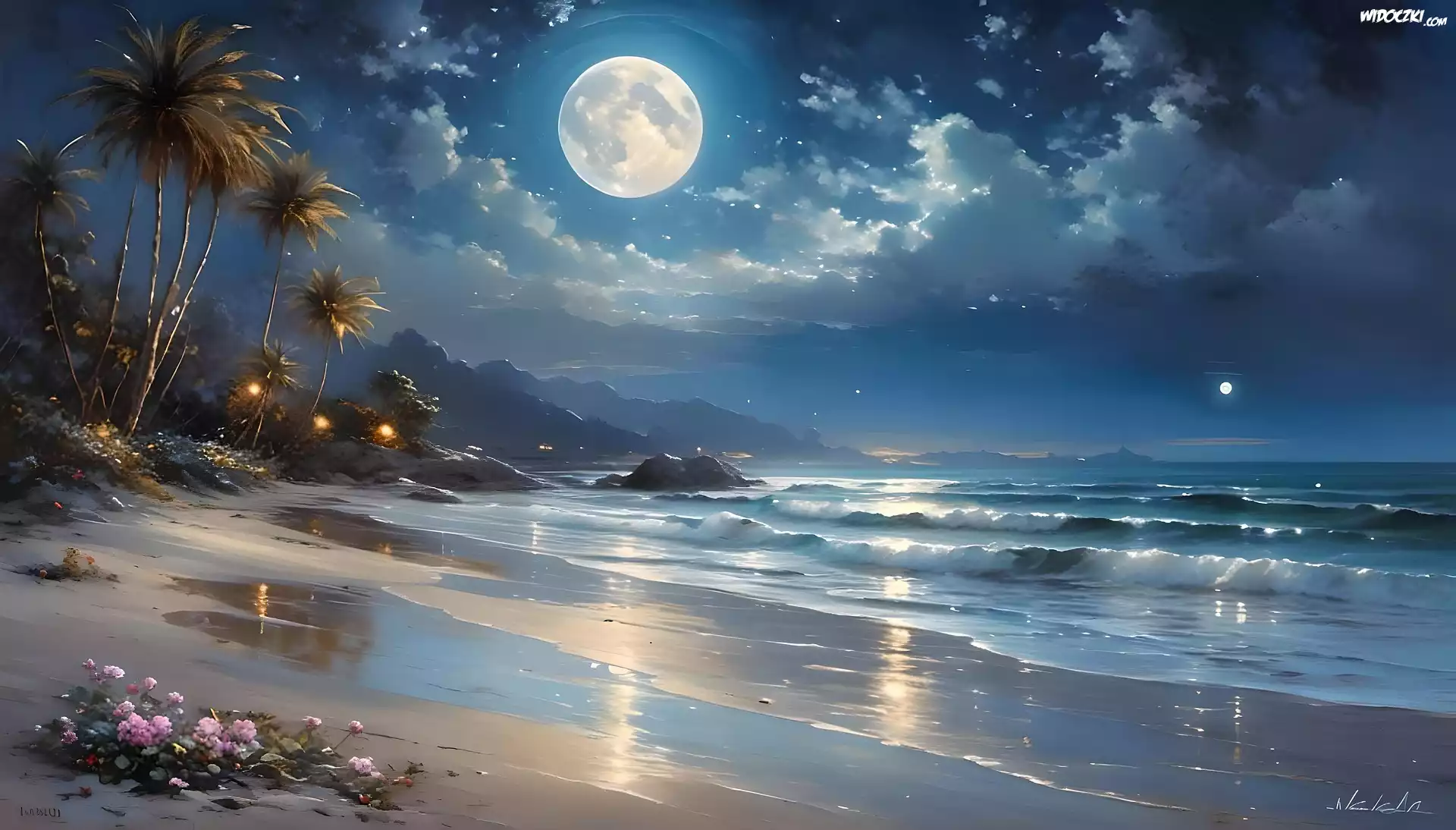 Zdjęcia, Morze, Plaża, Palmy, Noc, Księżyc