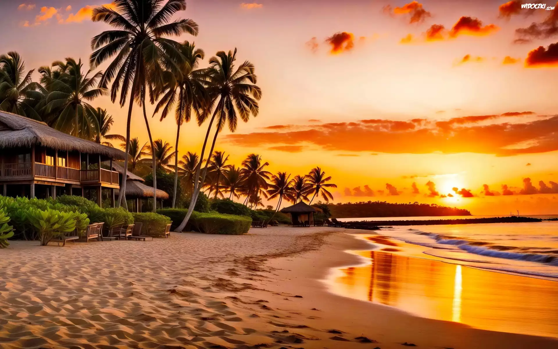 Zachód słońca, Morze, Plaża, Domy, Palmy