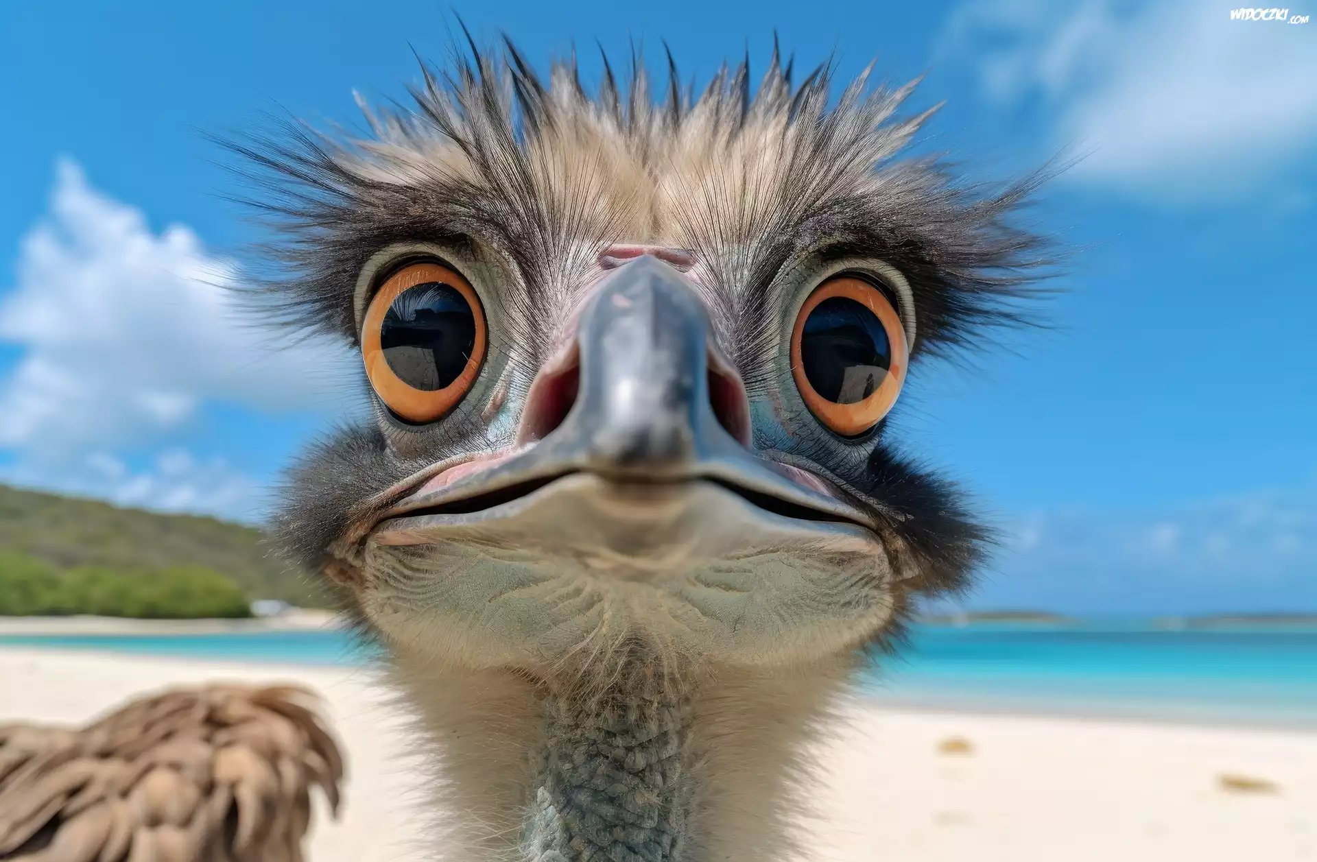 Zdjęcia, Struś, Ciekawość, Głowa, Plaża, Grafika, Ptak