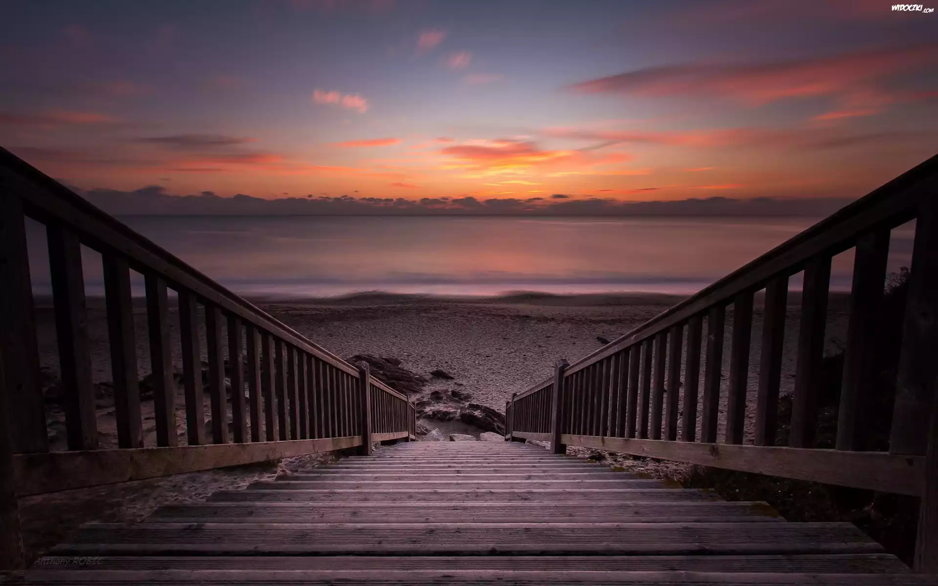 Morze, Plaża, Zachód Słońca, Niebo, Chmury, Lato, Schody