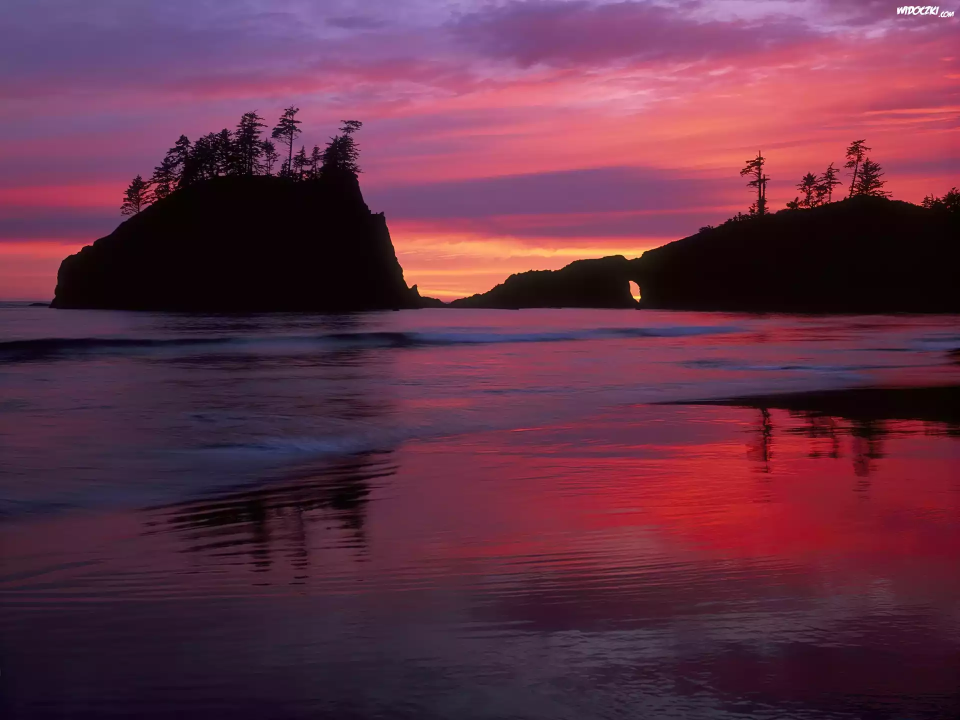 Plaża, Zachód, Słońca, Skały, Drzewa