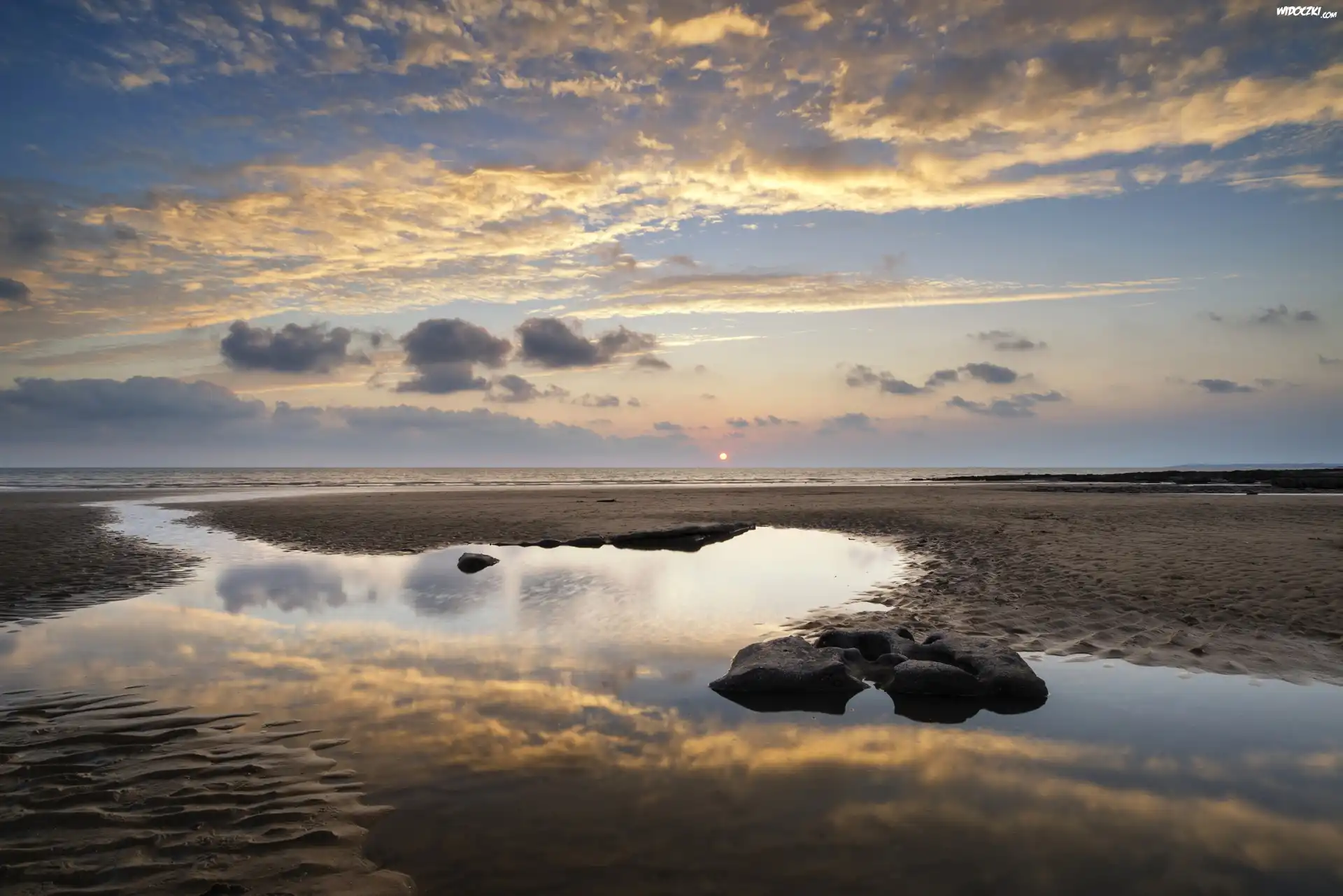 Zdjęcia, Walia, Plaża, Dunraven Bay, Chmury, Świt, Wschód słońca
