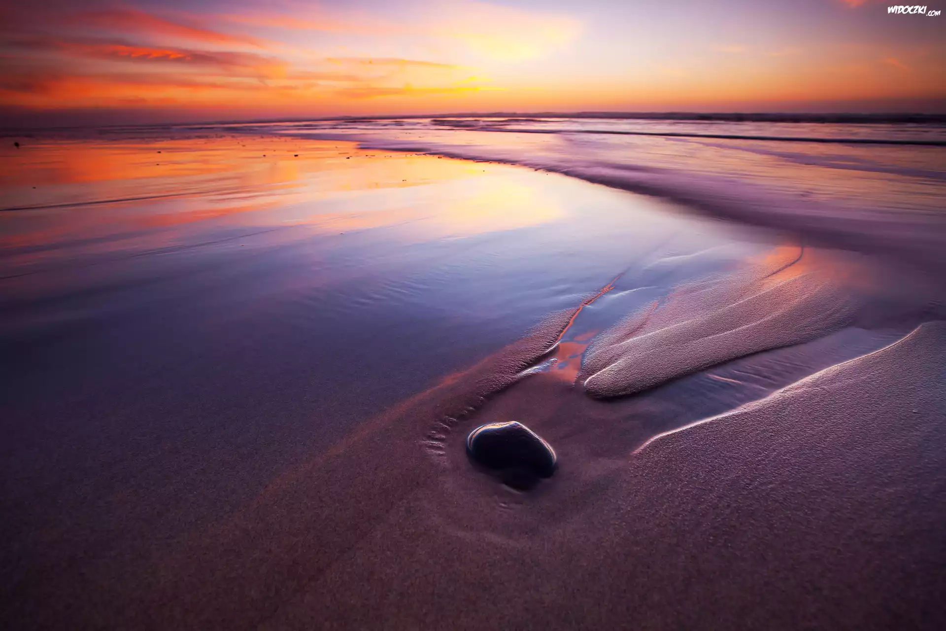 Zdjęcia, Plaża, Morze, Zachód słońca, Kamień