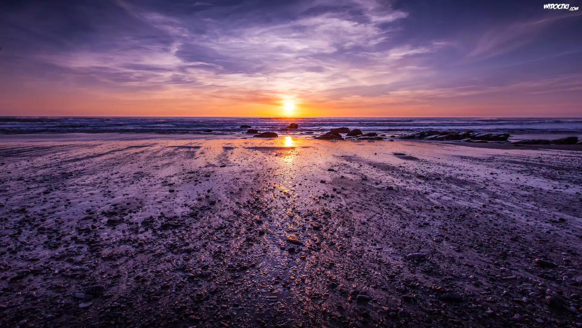Zdjęcia, Plaża, Morze, Zachód słońca, Kamienie