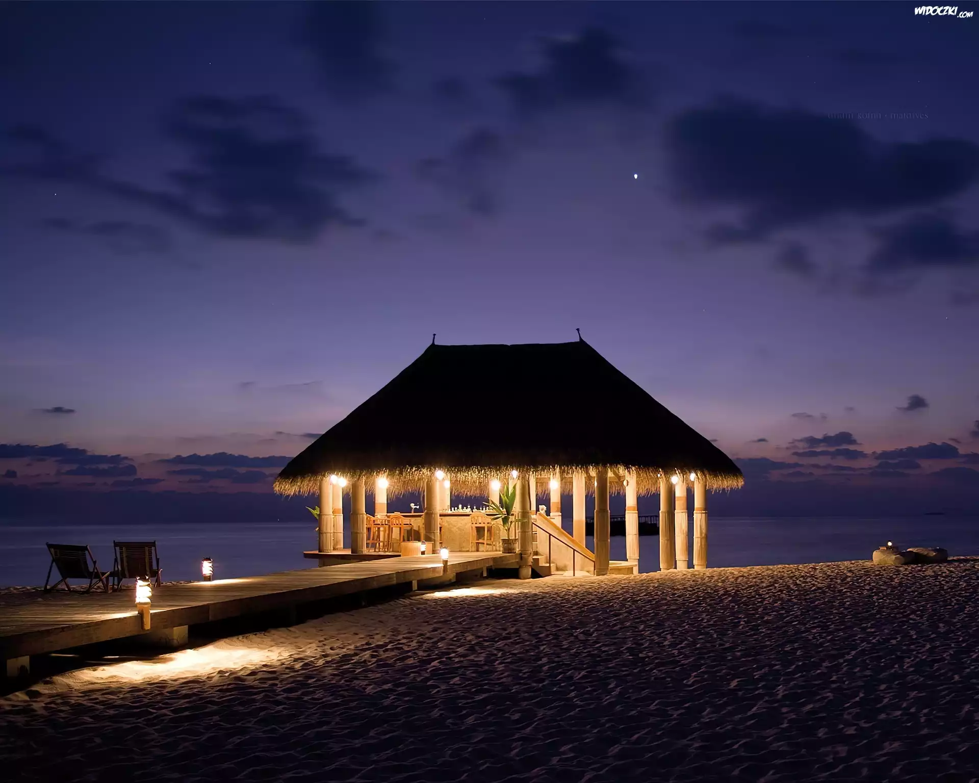 Zdjęcia, Plaża, Pomost, Oświetlony, Szałas, Tropik