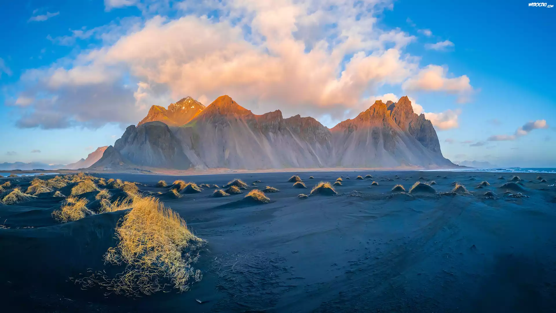 Islandia, Góry, Vestrahorn, Plaża, Kępki, Trawy
