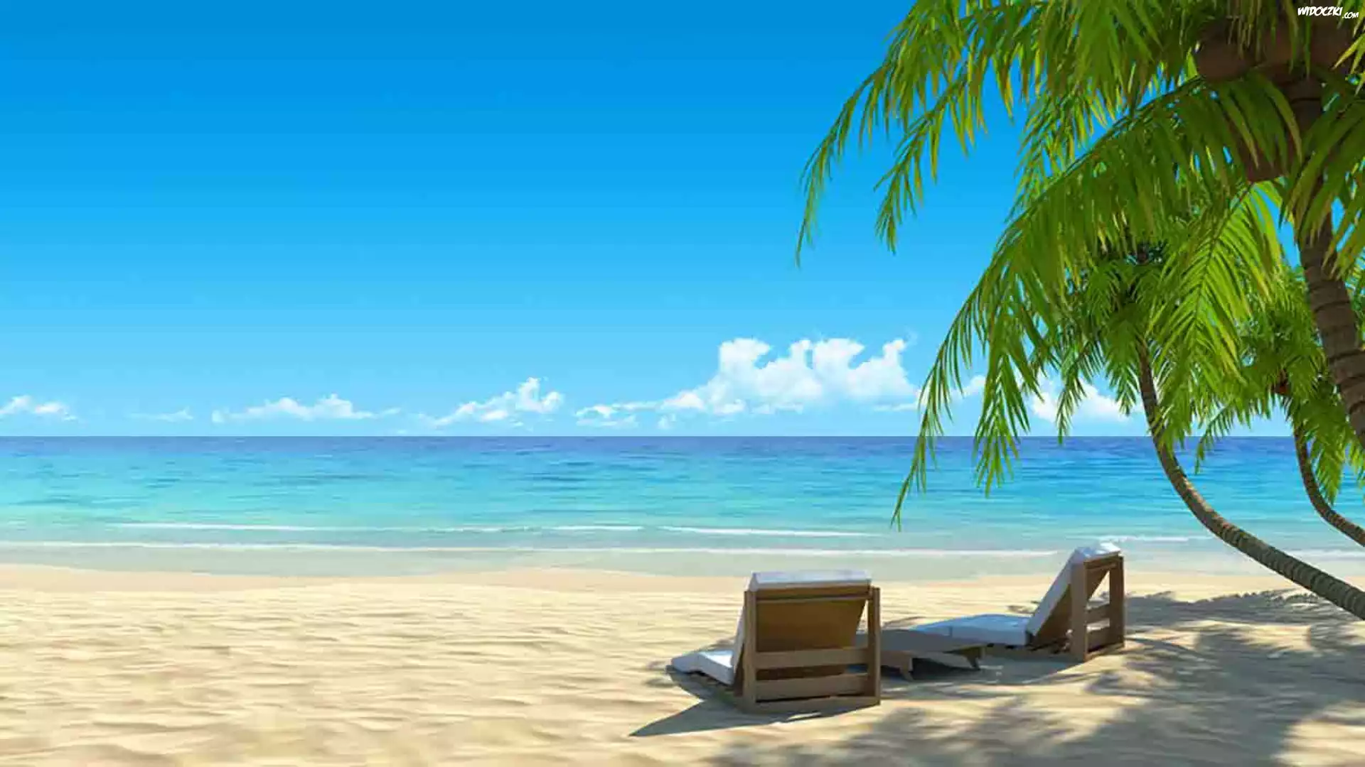 Zdjęcia, Plaża, Leżaki, Palmy, Morze, Tropiki, Wakacje