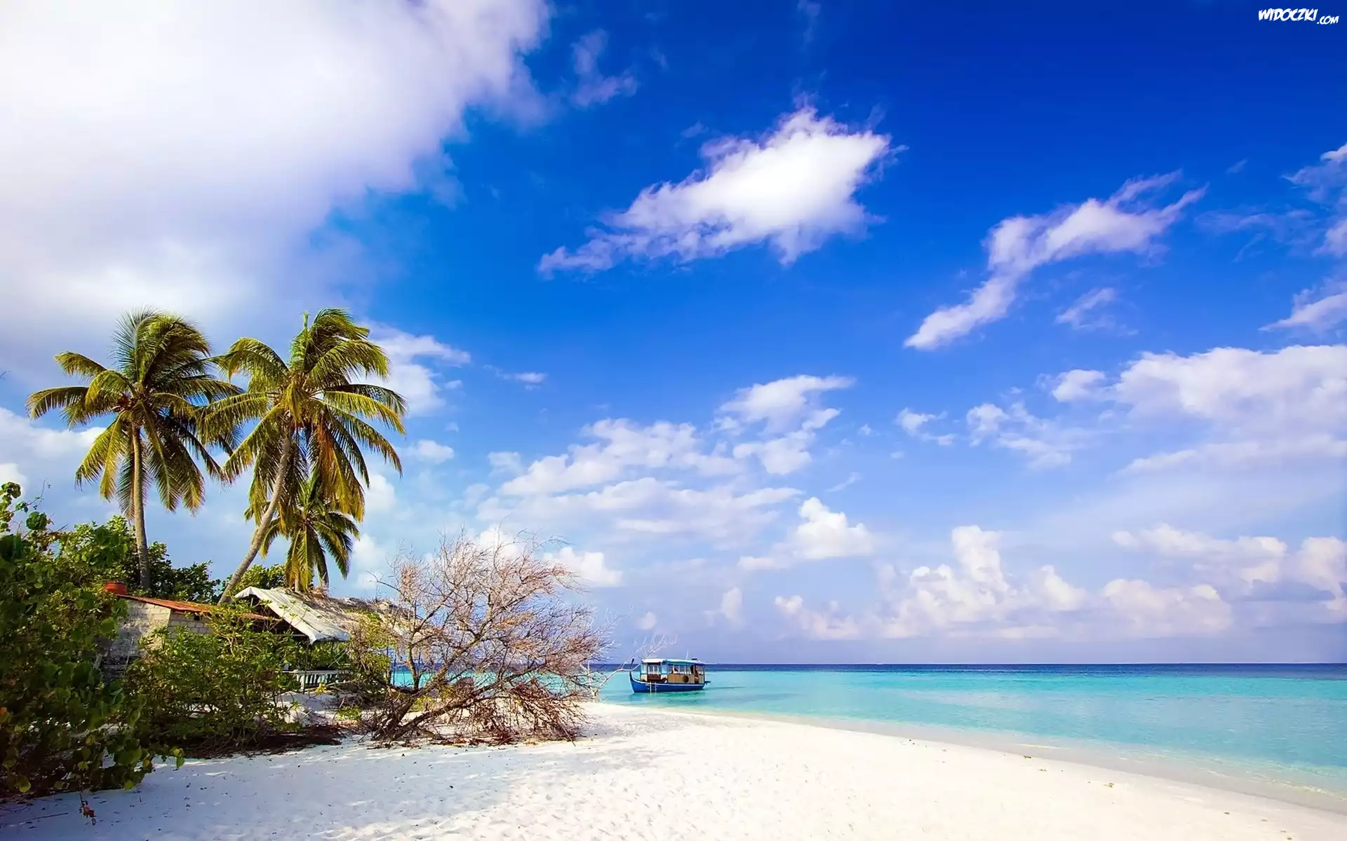 Zdjęcia, Plaża, Palmy, Niebo, Woda, Chmurki